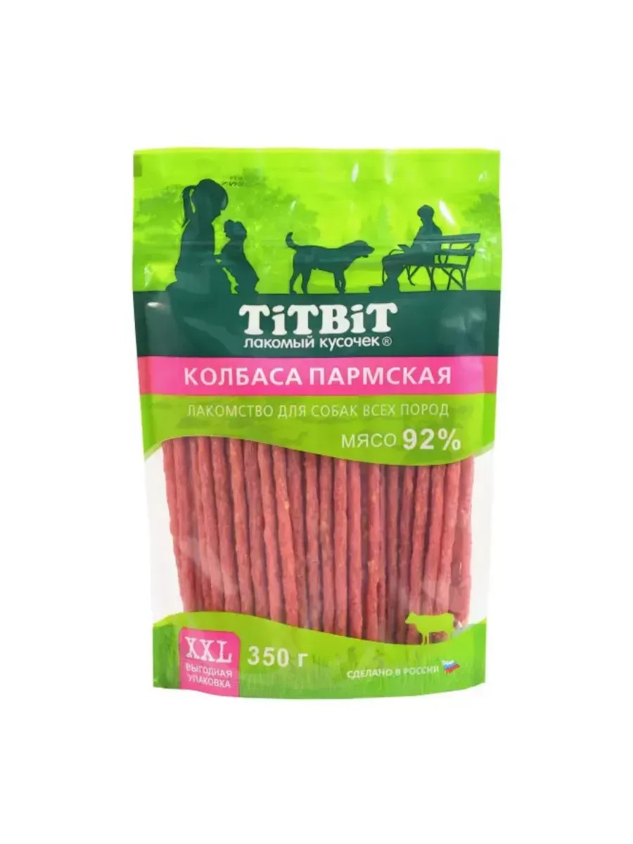 TiTBiT Лакомство для собак колбаса Пармская, для всех пород, 350 г. Колбаса Пармская - это аппетитное угощение для собак всех пород. Благодаря высокому содержанию мяса (92%) и бережной технологии приготовления, имеет привлекательный внешний вид и вкус.