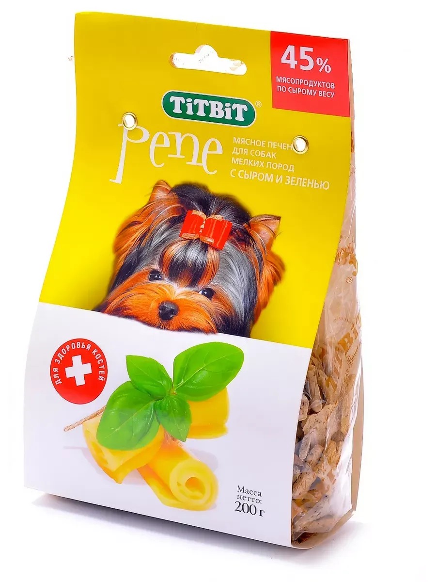 TiTBiT "Pene" Dog Treats with Cheese and Herbs, 200g. : Cheese contains up to 22% protein, up to 30% fat, and up to 700 mg of calcium and phosphorus mineral salts. Cheese protein is a source of essential amino acids and can enhance the amino acid profile of other food proteins. Milk fat contains lecithin, which plays an important role in proper fat metabolism in dogs. Cheese is a source of vitamin A and B vitamins. Its nutritional and flavorful properties stimulate appetite. Spinach contains complete proteins that are easily digestible by dogs, almost all known vitamins, and is also rich in iron, phosphorus, calcium, and potassium salts. Purpose: for encouragement, for training. Ingredients: Whole wheat flour 66%, beef 8%, vegetable oil 6%, cheese 5%, rice flour 5%, corn flour 4%, beef intestines 3%, spinach 2%, molasses 1%. Nutritional value: proteins 11.2 g, fats 9 g, fiber 1.6 g, ash 1.2 g, moisture 8 g. Energy value per 100 g: 408 kcal.
