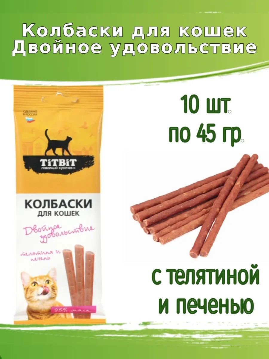 Колбаски для кошек TitBit с телятиной и печенью представляют собой вкусное и полезное лакомство, которое придется по вкусу вашему питомцу. Благодаря сочетанию двойного вкуса, эти колбаски нравятся кошкам вдвойне.