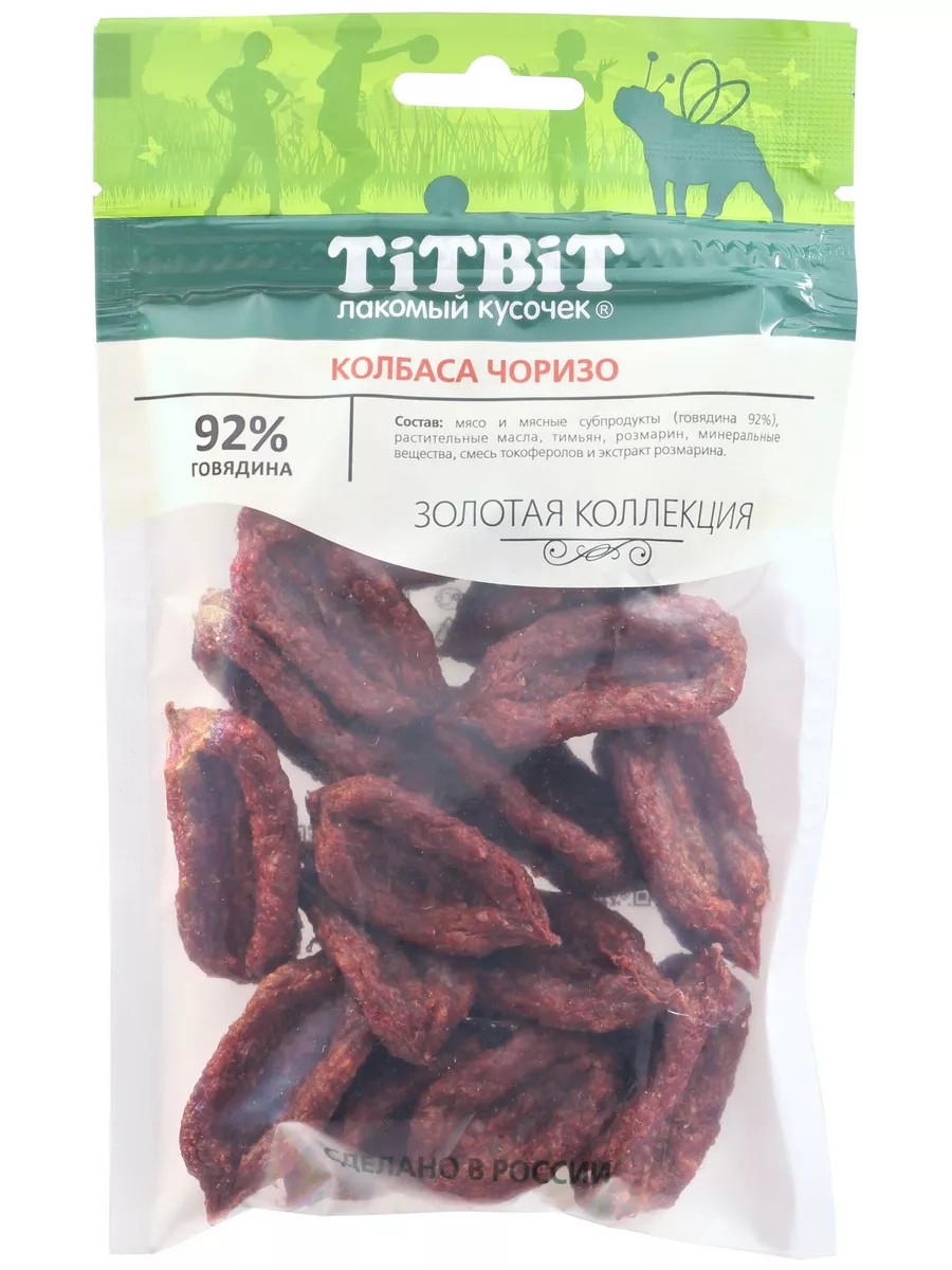 Золотая коллекция – это линейка лучших лакомств TITBIT, разработанных при участии владельцев домашних животных и их питомцев. Секрет идеального вкуса «Чоризо» в свежем, мелко нарубленном мясе, с добавлением пряных трав. Удобная упаковка и тонкая нарезка делает процесс угощения простым и комфортным.