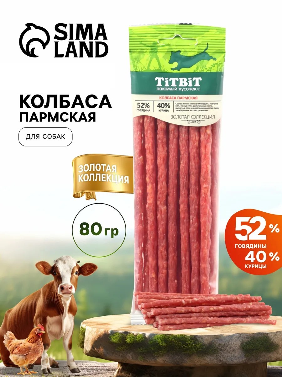 TitBit Parma Sausage "Golden Collection" for Dogs, 80g. The Gold Collection is a line of TITBIT's finest treats, developed with the input of pet owners and their pets. Parma sausage is made with beef and chicken fillet and enhanced with a pinch of nutmeg, adding a touch of sophistication to its delicate flavor. These treats are a supplement to nutrition and do not replace daily, full meals. Please provide your pet with a bowl of fresh drinking water.