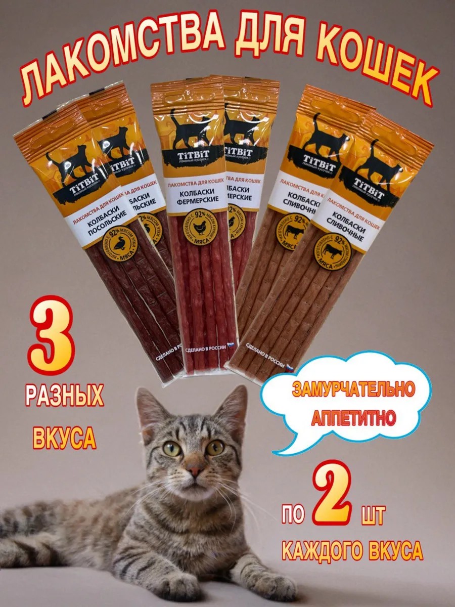 Три вида колбасок из лакомого набора для кошек: Посольские колбаски, Сливочные колбаски и Фермерские колбаски. Каждый вид колбасок содержит отборную говядину и дополнительные ингредиенты, такие как куриное филе, сливки или куриное филе. Лакомства разработаны с учетом предпочтений кошек и содержат необходимые витамины для поддержания здоровья. Колбаски могут быть использованы как угощение или в качестве игрушки для кошек. Лакомый набор для кошек TITBIT представляет собой идеальное сочетание вкуса и питательности для вашего питомца. Колбаски для котят можно использовать вместо игрушка, где ваш котенок будет охотиться за добычей. Ваша кошечка с удовольствием заберет угощение в свой домик для кошки. Дрессировка кошек будет успешнее с кормом и лакомствами titbit для котят и взрослых котов.
