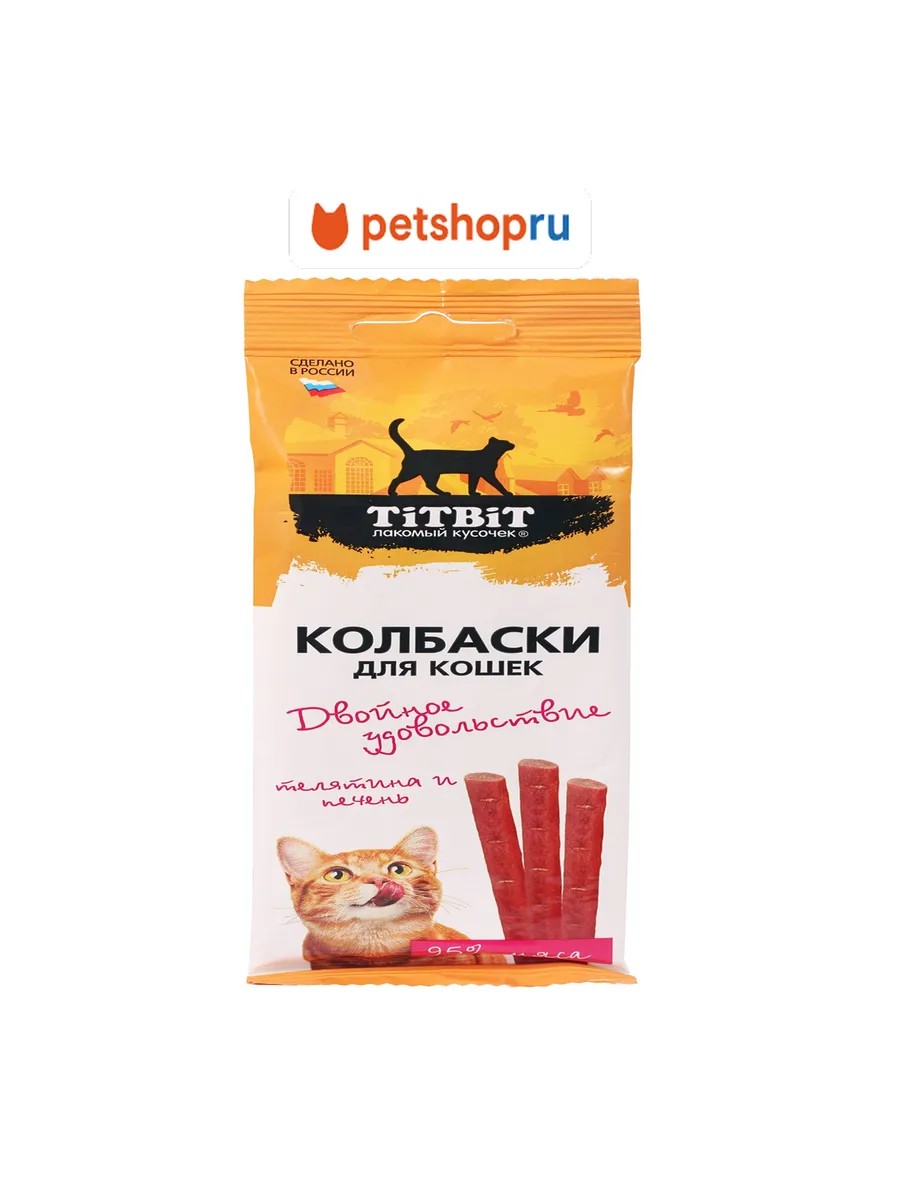 Колбаски для кошек, телятина и печень, 45 г Колбаски для кошек Двойное удовольствие - это колбаски, которые благодаря сочетанию двойного вкуса нравятся кошкам вдвойне.
