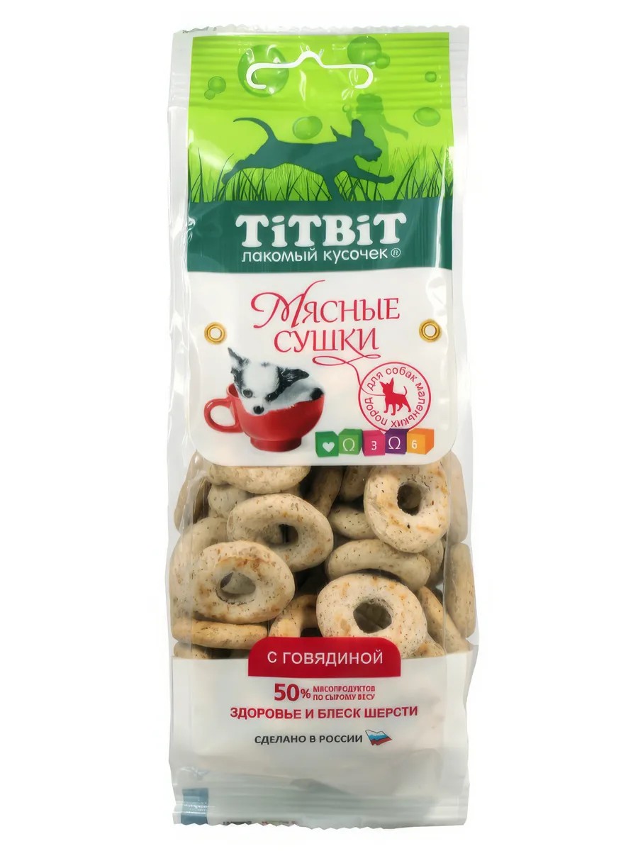 Лакомство TiTBiT мясные сушки для собак, с говядиной, 100 г. Мясные сушки с говядиной это печенье классической округлой формы, повторяющей форму всеми любимой традиционной русской выпечки. Omega 3, 6 в составе печенья поддерживают здоровье и блеск шерсти животного. Идеально подходят для угощения и поощрения собак мелких пород. Не содержат искусственных красителей, консервантов, ароматизаторов. Назначение для поощрения, для дрессуры Состав Мука из цельной пшеницы 63 % , говядина 15 % , масло растительное 7 % , яблоко 5 % , можжевеловая ягода 5 % , брусника 5 % Пищевая ценность жиры 25 г , белки 15 г , влага 13,5 г , клетчатка 2,7 г , зола 0,6 г . Энергетическая ценность в 100г : 345 ккал Срок годности 9 месяцев Условия хранения Хранить при температуре от +4С до +25С и относительной влажности не более 75%.