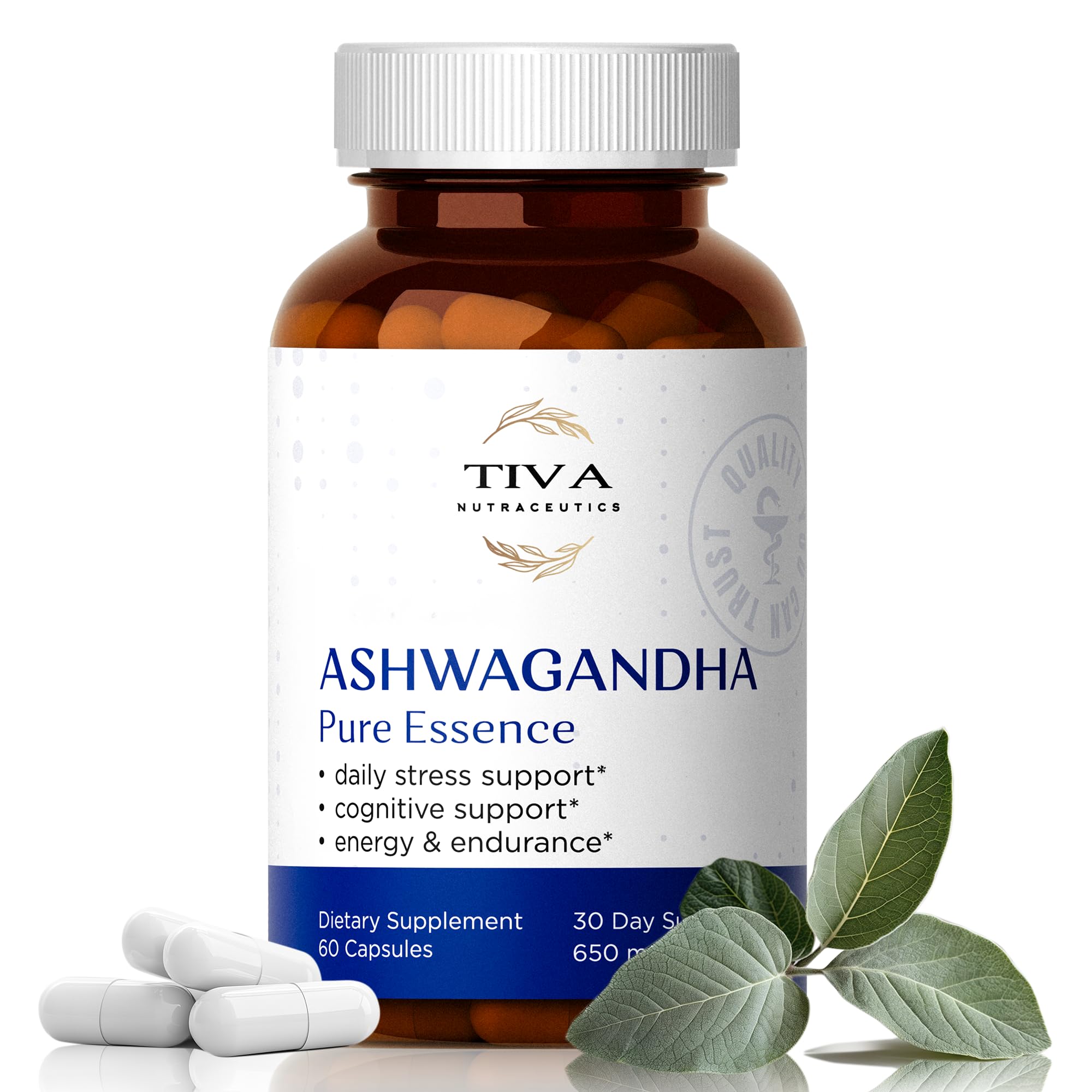 TIVA Ashwagandha Capsules 650mg with Black Pepper Extract Natural Support for Stress Metabolism Immune Function & Mood Vegan Non-GMO Lab-Tested 60 Herbal Capsules