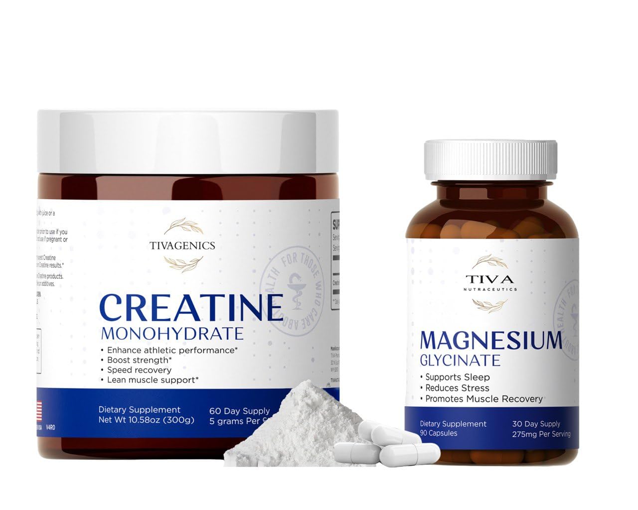 TIVAGENICS Creatine Monohydrate + Magnesium Glycinate Supplement | Muscle Strength Recovery & Sleep Support | Unflavored Powder + 90 Capsules | Vegan Non-GMO