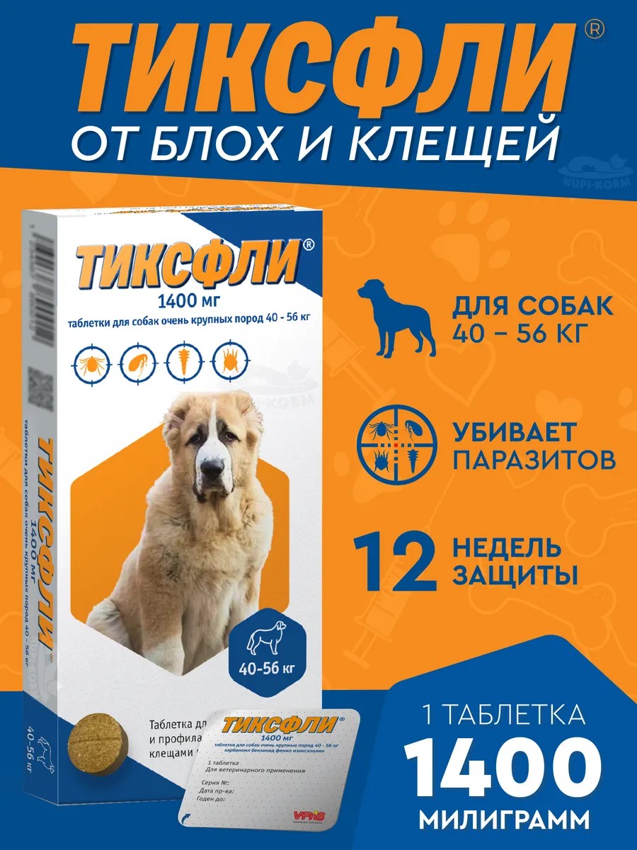 TIXFLY - an insectoacaricidal drug in the form of tablets for dogs against fleas, ticks, lice and biting lice (analogue of BRAVEKTO) - the duration of action of the drug is 90 days