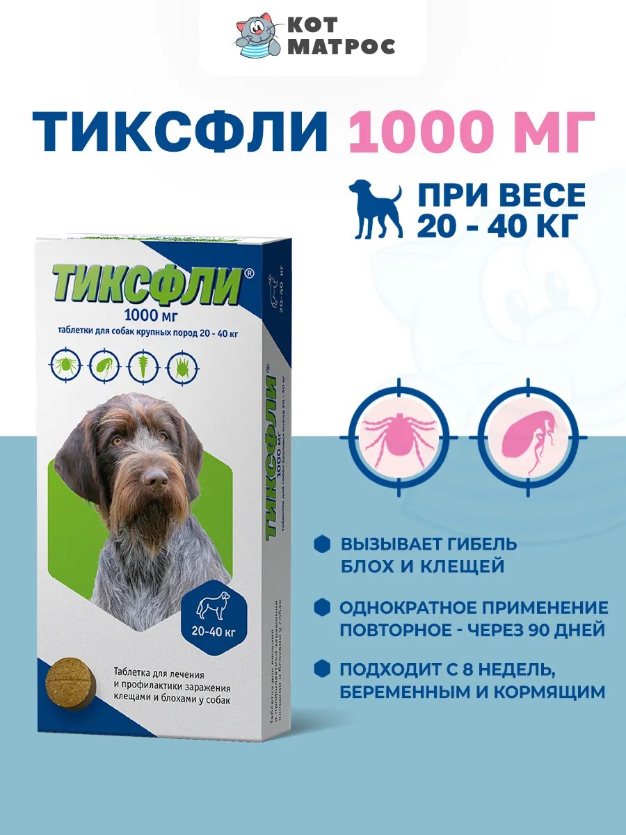 Тиксфли - таблетки от блох и клещей. Средство от блох и клещей в форме таблетки подходит для всех собак, включая мелкие и крупные породы. Дозировка зависит от веса собаки.