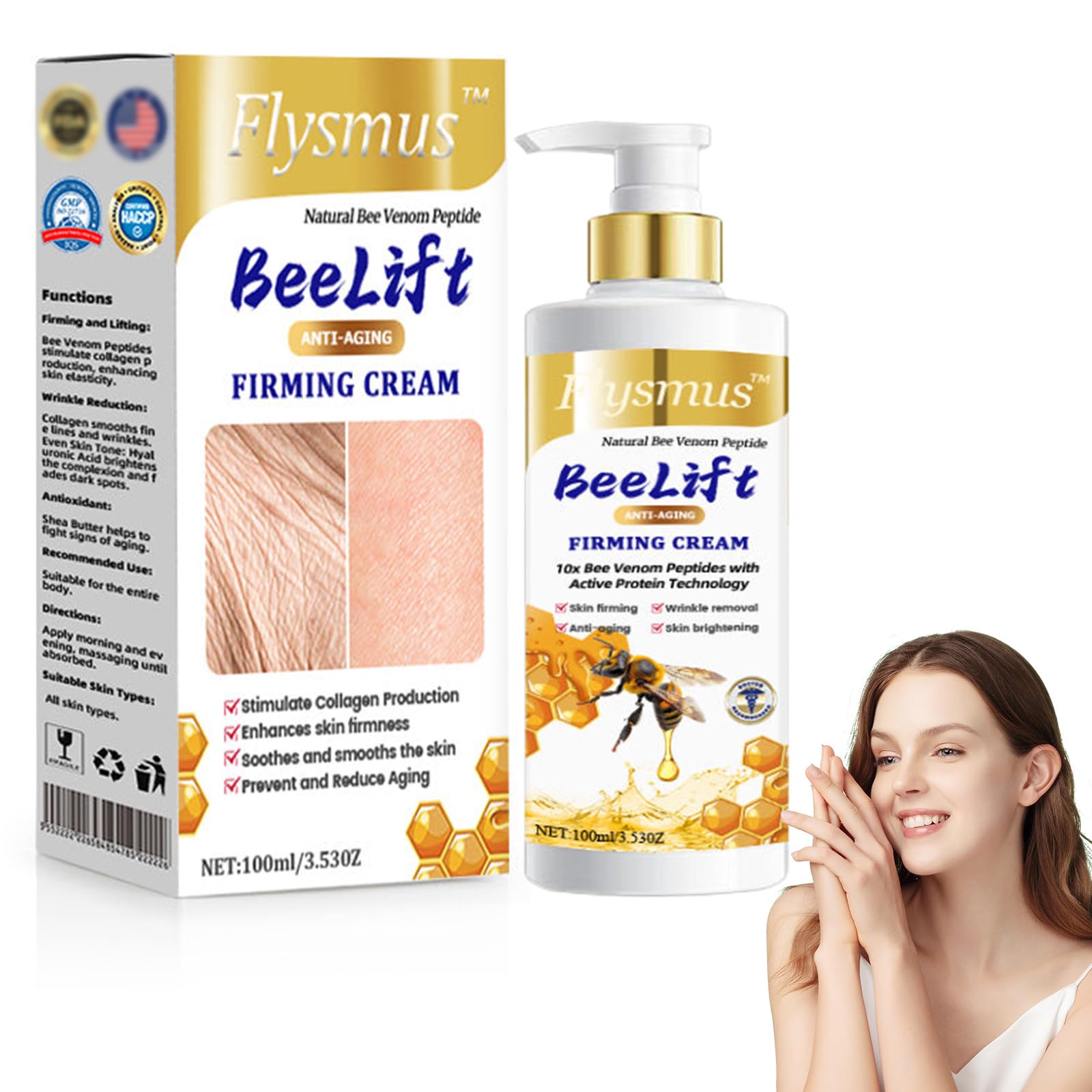 Suitable for All Skin Types Suitable for all skin types, including dry skin, mixed skin and sensitive skin. Hyaluronic Acid A powerful hydrator that attracts moisture to theskin, helping to plump and smooth dry or fine lines. Boost Skin Elasticity Collagen is a key protein that supports skin structure,providing elasticity and firmness. lt helps reduce sagging andwrinkles. Bee Firming Cream Bee venom peptides stimulate bloodcirculation, promote colagen production, and tighten skin,reducing wrinkles and puffiness. Firming Cream This BeeLift Anti-Aging Firming Cream isto lift, tighten, and rejuvenate skin, while reducing the appearance of fine lines and wrinkles.