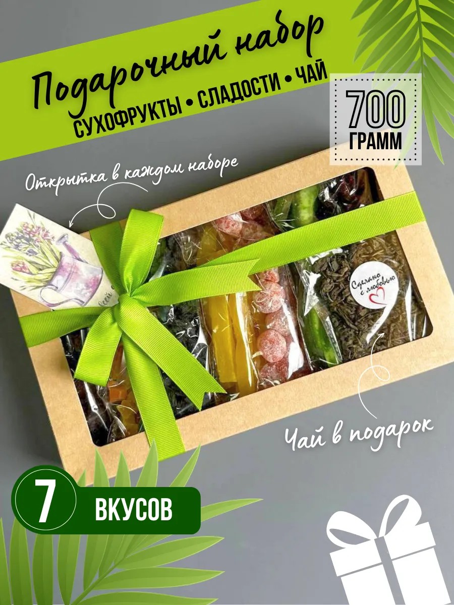 | Комплектация | сухофрукты ассорти; подарочная упаковка; бант; открытка; бокс вкусняшек |