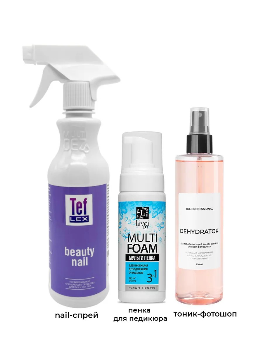 | Комплектация | Multi Foam - мультибанка для рук и ног 3 в 1 дезинфицирующая, 180 мл; Бьюти Нэйл - универсальное средство обработка рук при маникюре (триггер), 500 мл; Dehydrator - дегидратирующий тоник для рук с эффектом фотошопа, 250 мл |