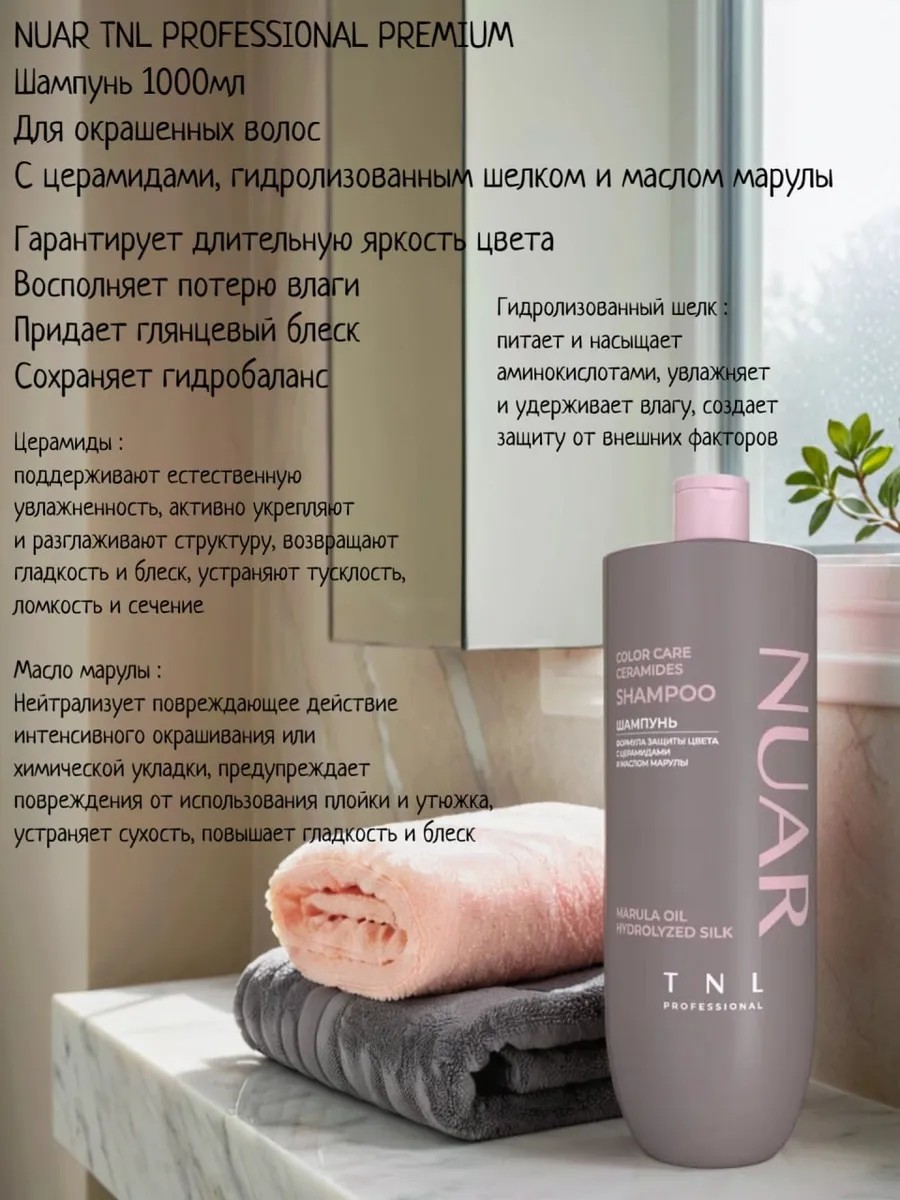 | Полное наименование товара | Шампунь для волос NUAR формула защиты цвета с церамидами, гидролизованным шелком и маслом марулы, TNL Professional, 1000 мл |
