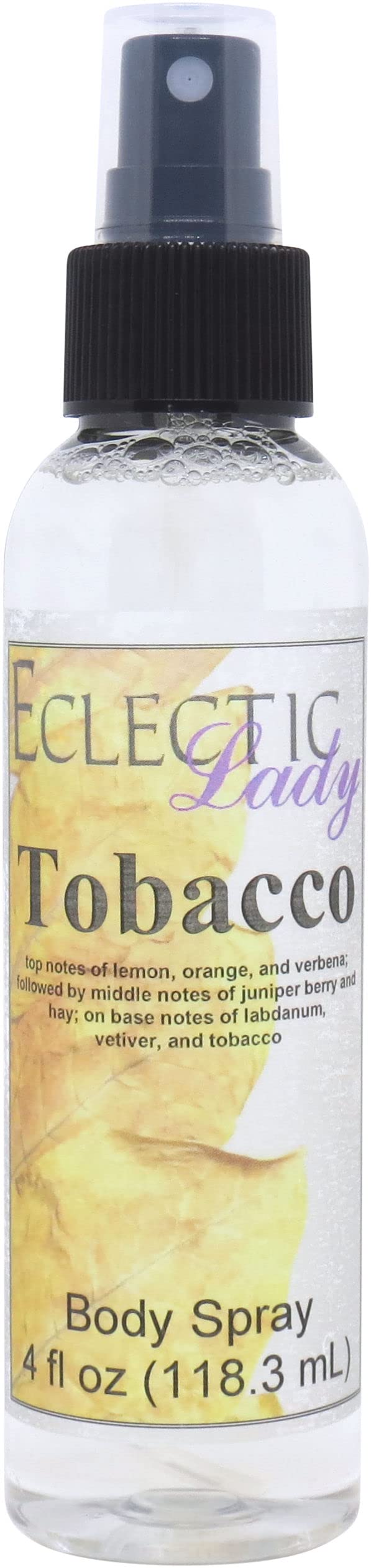 Our Tobacco fragrance is a fresh, citrus top with juniper berries and woodsy notes of vetiver. This wonderful scent begins with top notes of lemon, orange, and verbena;. followed by middle notes of juniper berry and hay; all sitting on base notes of labdanum, vetiver, and tobacco. This fragrance is phthalate free. PARABEN-FREE - We take pride in selecting our ingredients, which is why our body spray is free from parabens. HANDCRAFTED - Each bottle of our body spray is handcrafted in the USA, ensuring the highest quality and attention to detail. ORIGINAL STRENGTH FRAGRANCE - Our classic body spray formula for a softer fragrance.DOUBLE STRENGTH FRAGRANCE - Our Double Strength formula contains double the fragrance of our original body sprays for people who prefer a stronger and more long-lasting scent. HYDRATING MIST - Made with vegetable glycerin, a humectant, our body sprays help attract moisture to your skin keeping it hydrated and refreshed.