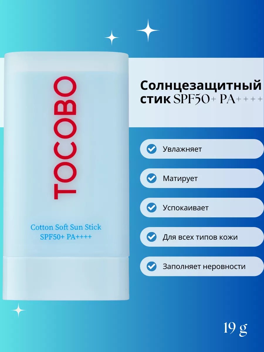 Tocobo Cotton Soft Sun Stick SPF50+ PA++++ sebum-regulating sunscreen stick is simple and easy to use, applying and spreading smoothly over the skin. Its high UV protection effectively prevents unwanted pigmentation and tanning, and also blocks the breakdown of collagen and elastin fibers caused by the sun's harsh rays. Contains three photostable, safe, next-generation chemical filters. Its compact size fits easily in a handbag. It's easy to reapply the protective layer throughout the day, and its mattifying effect eliminates shine. It absorbs excess sebum and leaves a powdery, silky finish. Key active ingredients: Anti-Sebum P Complex (pine, elm, evening primrose, and kudzu extracts) - the cream suppresses excess sebum and regulates sebum secretion: it normalizes oiliness and eliminates shine. Cotton extract is a rich source of flavonoids, tannins, and minerals such as phosphorus, magnesium, and calcium. It soothes and effectively relieves irritation, protects the skin from harmful external factors, and perfectly moisturizes. Tocopherol protects against the negative effects of external factors and prevents the oxidation of unsaturated lipids. It intensively saturates the skin with vitamins. Neem leaf extract heals, has anti-inflammatory and antiseptic properties, makes the skin smooth and silky, and regulates sebum production. Eggplant extract deeply moisturizes and saturates with beneficial microelements. It treats acne and other inflammations, lightens age spots and post-acne marks, and perfectly tones. Aloe extract has a healing and antimicrobial effect, soothing irritation. It deeply hydrates and saturates cells with beneficial vitamins, strengthening the protective barrier. Turmeric extract evens out skin tone, has an antioxidant effect, and maintains youthfulness.