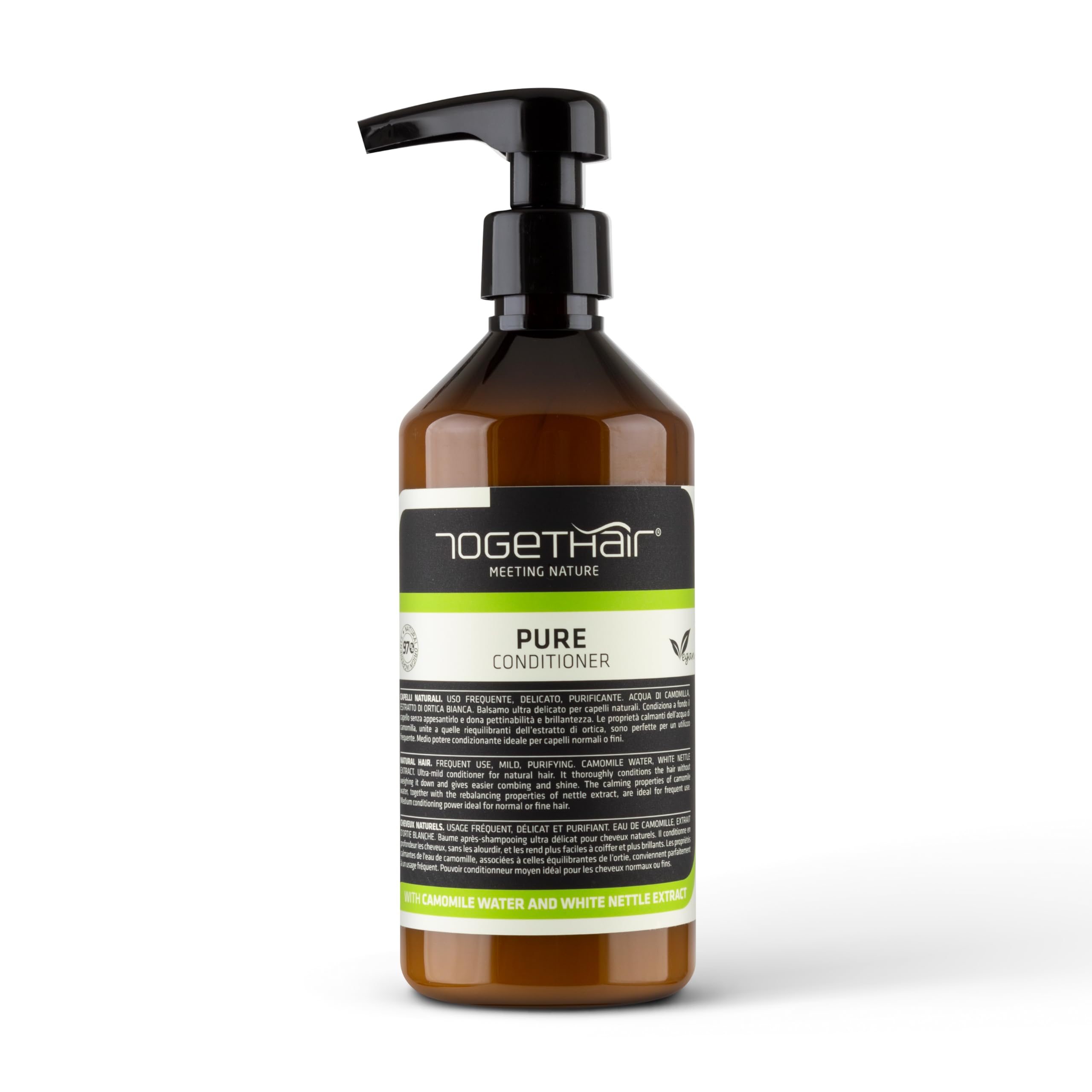 Cares for the hair thoroughly, without weighing it down and provides combability and shine. The calming properties of chamomile water combined with the balancing properties of nettle extract are perfect for frequent use. INGREDIENTS Aqua, erythritol, cetearyl alcohol, glycerin, behenyl alcohol, Prunus Amygdalus Dulcis Oil , Anthemis Nobilis Flower Water , Cocos Nucifera Oil , Lamium Album Extract, Plant Agopsyllium Seed Extract, Panax Ginseng Root Extract, Panthenol, Tocope. heryl acetate, Benzyl alcohol. Cetrimonium chloride, Guar Hydroxypropyl trimonium chloride, perfume, limonene, lacticacide, ethylhexylglycerin, citral, linalool organic SAFETY WARNING no See moreNature index 98 .Togethair Pure Conditioner, 500 ml, ultrazachte conditioner voor natuurlijk haar, ideaal voor veelvuldig gebruik Verzorgt het haar grondig, zonder het te verzwaren en geeft kambaarheid en glans. De kalmerende eigenschappen van kamillewater in combinatie met de balancerende eigenschappen van brandnetelextract zijn perfect voor veelvuldig gebruik. INGREDIËNTEN Aqua, erythritol, cetearyl alcohol, glycerine, behenyl alcohol, Prunus Amygdalus Dulcis Oil , Anthemis Nobilis Flower Water , Cocos Nucifera Oil , Lamium Album Extract, Plant Agopsyllium Seed Extract, Panax Ginseng Root Extract, Panthenol, Tocope. heryl acetaat, Benzyl alcohol. Cetrimoniumchloride, Guar Hydroxypropyl trimoniumchloride, parfum, limoneen, lacticacide, ethylhexylglycerine, citral, linalool organisch VEILIGHEIDSWAARSCHUWING nee Meer bekijkenNatuurindex 98 .