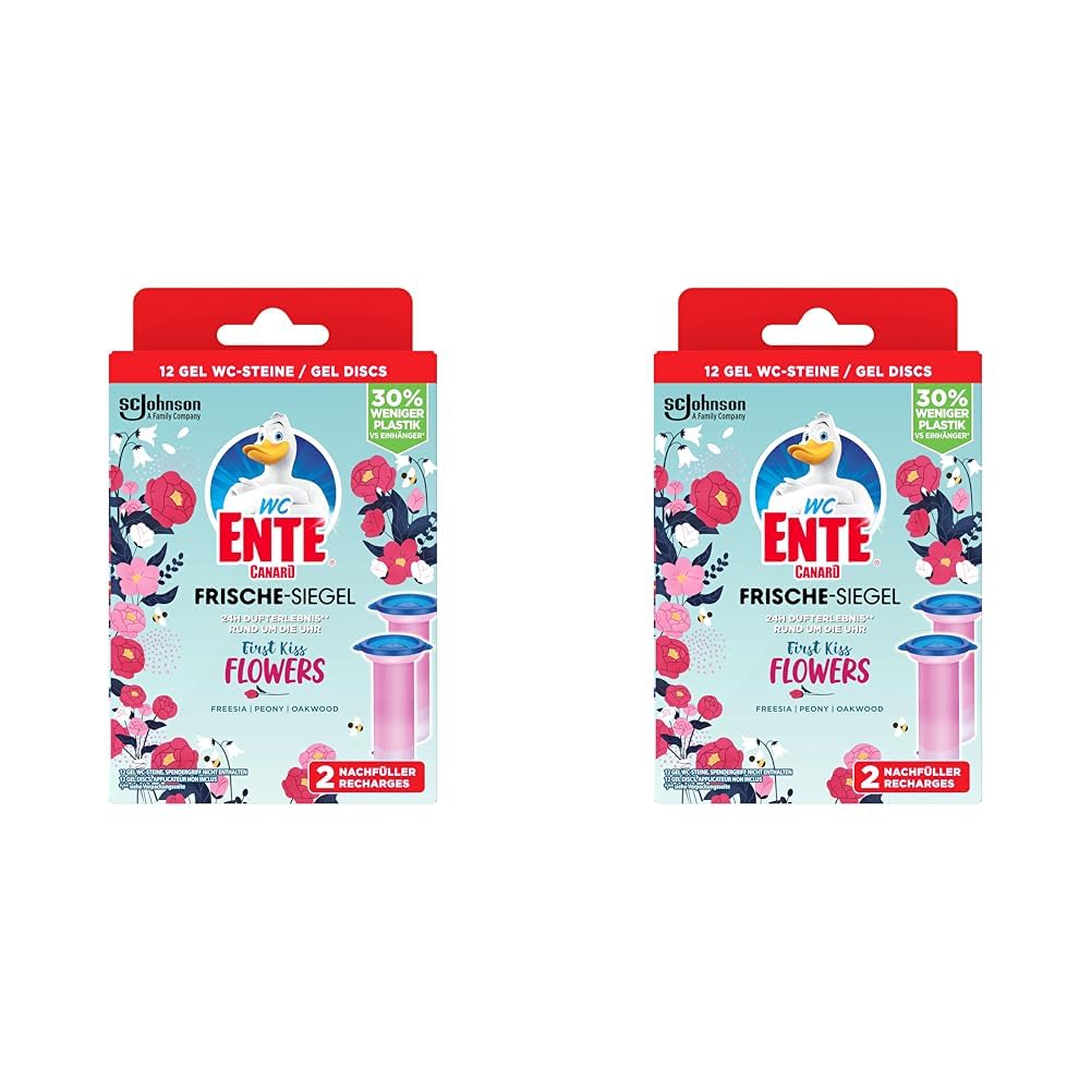 Ingredients ingredients 1- (2,6,6-trimethyl-3-cycloHexen-1-yl) -2-broth-1-on, 3.7-dimethyloctan-3-ol and alpha hexylzimtaldehydedelivery: 2 toilet duck freshness-Seal after filler, fragrance: First Kiss Flowers, volume: 2 x 36 ml (double pack).Practical: cup-free toilet cleaning with 30 less plastic VS hanger, refiller available in different scents, can also be used as a toilet cleaner, simply distribute the fresh seal with the toilet brush and clean the toilet.Hygienic: No contact with the toilet, replaces every monastery and forms a protective film after every rinsing to prevent urine stone, lime and germ formation.For long-lasting toilet freshness and cleanliness after each rinsing complete dissolving the self-adhering gel tabs without residues in the toilet, with every full donor up to 8 weeks of thorough cleaning and pleasant fragrance (anti-smell formula).The following information applies to each unit per pack.INHALTSSTOFFE ZUTATEN 1-(2,6,6-Trimethyl-3-cyclohexen-1-yl)-2-buten-1-on, 3,7-Dimethyloctan-3-ol und alpha-HexylzimtaldehydLieferumfang: 2 WC-Ente Frische-Siegel Nachfüller, Duft: First Kiss Flowers, Volumen: 2 x 36 ml (Doppelpack). Praktisch: Körbchenlose WC-Reinigung mit 30 weniger Plastik vs Einhänger, Nachfüller in verschiedenen Düften erhältlich, auch als Toilettenreiniger verwendbar, einfach das Frische-Siegel mit der WC-Bürste verteilen und das WC putzen. Hygienisch: kein Kontakt mit der Toilette, ersetzt jeden Klostein und bildet einen Schutzfilm nach jeder Spülung zum Verhindern von Urinstein, Kalk und Keimbildung. Für langanhaltende WC-Frische und Sauberkeit nach jedem Spülen Vollständiges Auflösen der selbsthaftenden Gel-Tabs ohne Rückstände in der Toilette, mit jedem vollen Spender bis zu 8 Wochen gründliche Reinigung und angenehmen Duft (Anti-Geruch Formel). Die folgenden Informationen gelten für jede Einheit pro Packung.WC-Ente Frische-Siegel Nachfüller, körbchenloser WC-Reiniger, 12 Gel WC-Steine, First Kiss Flowers Duft, 2 x 36 ml (Packung mit 2) 36 ml (4er Pack) First Kiss Flowers