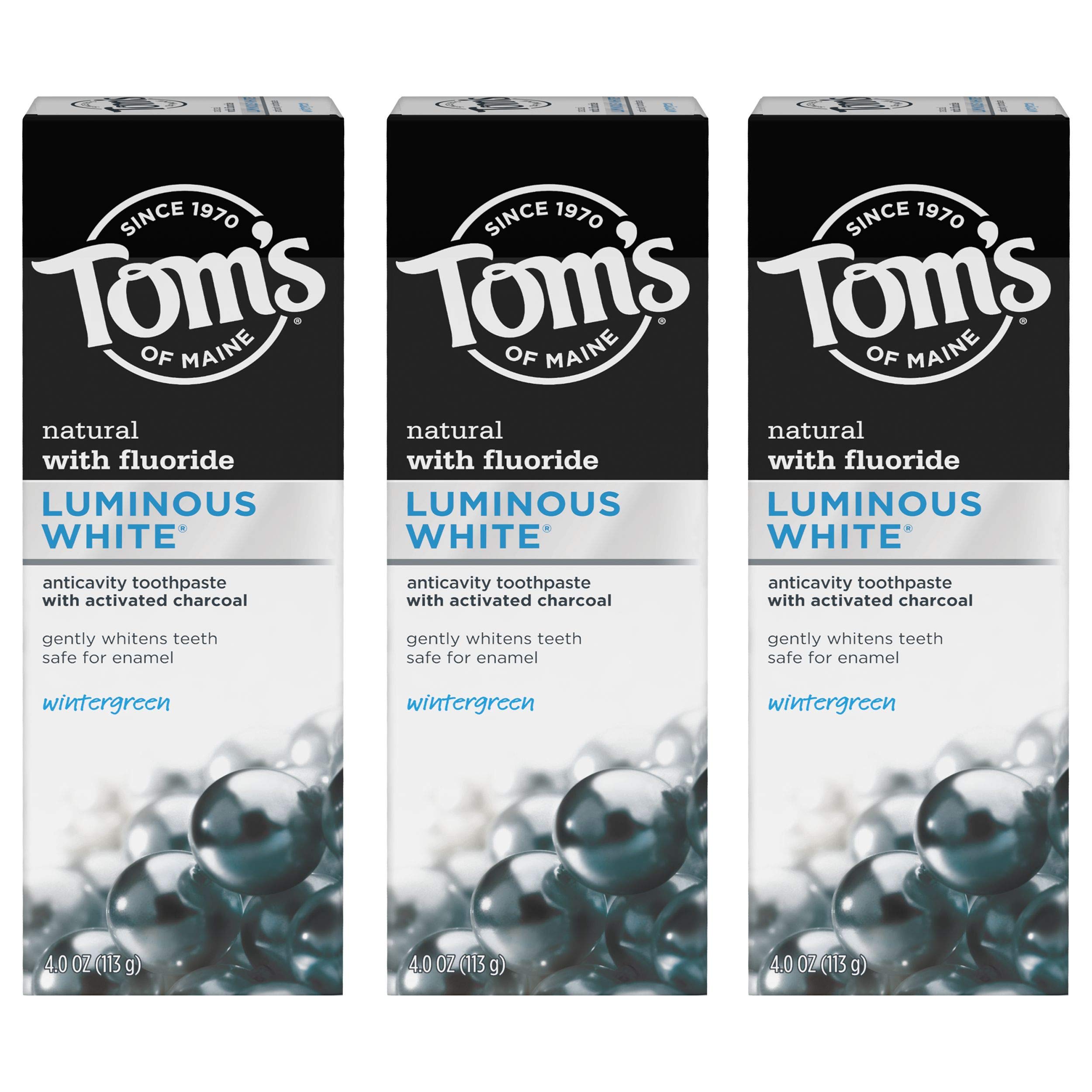 #1 Natural Toothpaste Brand, (Based in part on data reported by Nielsen through its Connect Service for the Toothpaste Category for the 52 week period ending 8/27/22, for the AOC market. Copyright © 2022 Nielsen.) Get ready for a smile that shines! Tom's of Maine Luminous White Natural Toothpaste with activated charcoal gives you naturally brighter and whiter teeth. With Tom's of Maine's most advanced whitening formula, you can experience whiter teeth in two weeks by removing surface stains compared to regular fluoride toothpaste. This whitening toothpaste with charcoal is gentle on enamel, fights cavities and is safe for everyday use. Plus, it's made with biodegradable or mineral-derived ingredients. What more do you need? And when you're done using your toothpaste, you can recycle the tube! Check to be sure that your tube has the blue recycling flag on it, squeeze out as much of the toothpaste from the tube as you can, replace the cap, and place the tube in your recycling bin. At Tom's of Maine, we want to empower families to live more naturally. With more than 50 years experience combining scientific know-how, naturally derived ingredients and a bit of ingenuity, we make products that are good for you and the planet. As a Certified B Corp, we hold ourselves to the highest social and environmental standards. Plus, we're committed to supporting local communities for meaningful change, donating 10% of our profits to charities supporting health, education and the environment. We call this "doing good, for real," and it impacts everything we do.TAKE CARE OF YOURSELF NATURALLY: Contains no artificial preservatives, colors or flavors and is not tested on animals. RECYCLABLE TUBE: Look for the blue recycling flag, squeeze out as much toothpaste as you can, replace the cap, and recycle. FIGHT CAVITIES: Fluoride toothpaste protects against cavities; cool peppermint freshens breath. GENTLY BRIGHTEN SMILE: Whitening toothpaste with charcoal designed to gently remove surface stains. WHAT YOU'LL GET: Three 4-ounce tubes of Tom's of Maine Luminous White Charcoal Toothpaste in Wintergreen Flavor.GTIN: 035000987778. Best Sellers Rank: See Top 100 in Health & Household. Material Type Free: Gluten free,Paraban Free,Trisoclan Free,Formaldehyde Free,Artificial Color Free,Butylparaben Free,Dye Free,Formaldehyde Donor Free,Mineral Oil Free,Phthalate Free,Propylparaben Free,Sodium Laureth Sulfate. Item Form: Paste. Age Range (Description): Adult. Flavor: Wintergreen. Brand: Tom's of Maine. : B08MGR2NSG. Manufacturer: Tom's of Maine. UPC: 035000987778. Item model number: 035000987778. Product Dimensions: 2.21 x 4.37 x 6.46 inches; 11.96 Ounces.