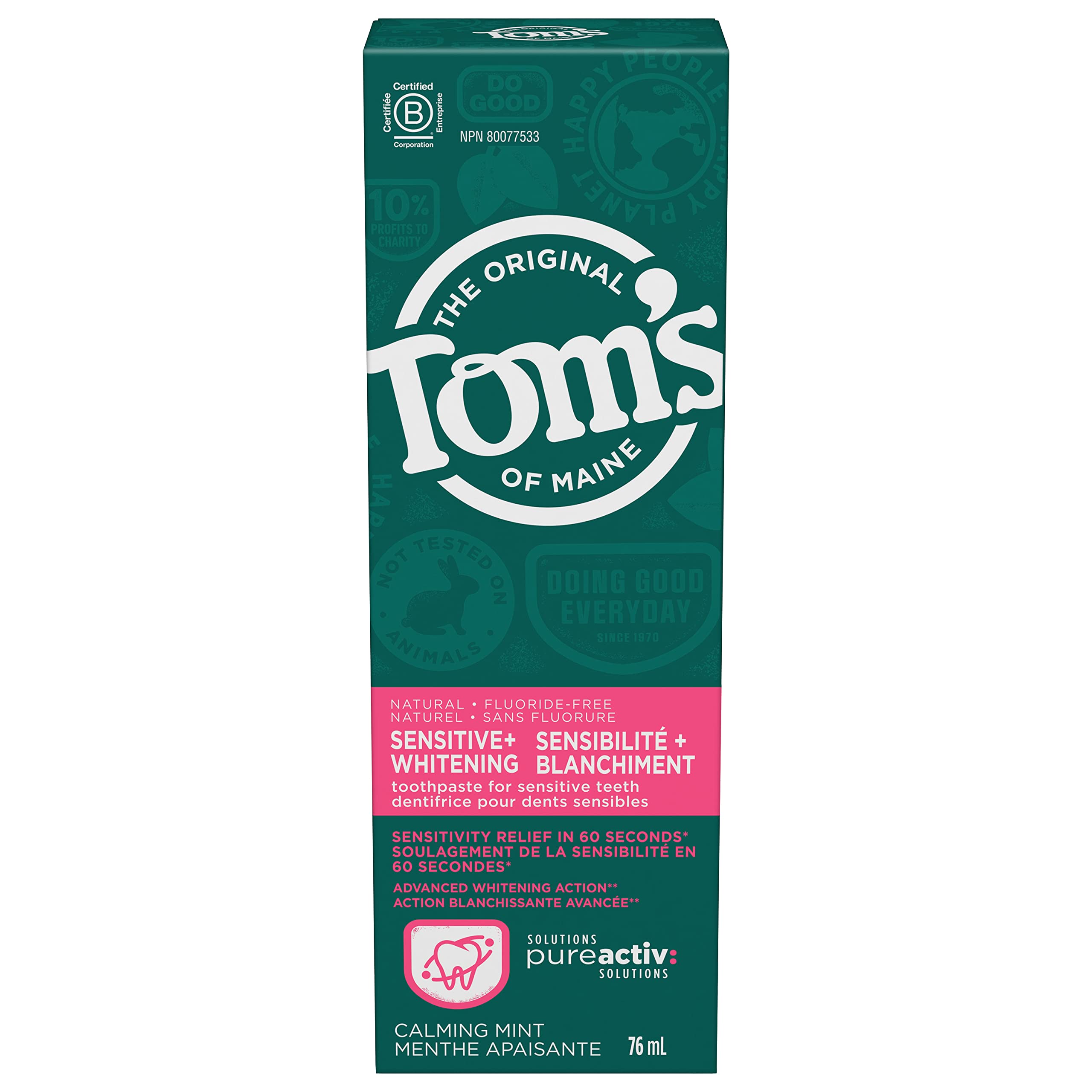 PUREACTIV SOLUTIONS contain pure (naturally-derived) ingredients and actively target your oral care needs. get sensitivity relief whitening all in one toothpaste. the arginine calcium carbonate complex delivers sensitivity relief within 60 seconds. this natural formula provides daily protection for sensitive teeth and safely whitens your teeth, with regular use. now isn't that something to smile about? happy brushing! At Tom's of Maine, we want to empower families to live more naturally. With more than 50 years experience combining scientific know-how, naturally derived ingredients and a bit of ingenuity, we make products that are good for you and the planet. As a Certified B Corp, we hold ourselves to the highest social and environmental standards. Plus, we're committed to supporting local communities for meaningful change, donating 10 of our profits to charities supporting health, education and the environment. We call this "doing good, for real," and it impacts everything we do. when used as directedTAKE CARE OF YOURSELF NATURALLY: Contains no artificial preservatives, colours or flavours and is not tested on animals. Calcium carbonate for advanced stain removal. Arginine calcium carbonate for sensitivity relief. Sensitivity pain relief in 60 seconds advanced whitening action (when used as directed). With regular use, it builds a protective barrier that acts like a seal against sensitivity. WHAT YOU'LL GET: 85mL tubes of Tom's of Maine PureActiv Sensitive Whitening Toothpaste in Calming Mint Flavour.