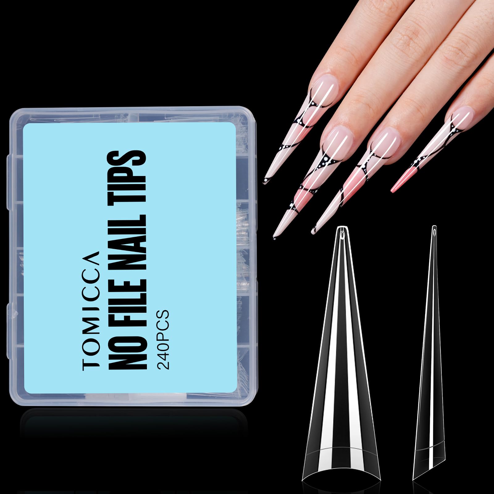 Multiple Uses: These acrylic false nails fit most nails and are perfect for professionals, nail art students, or DIY enthusiasts. They make the perfect gift for birthdays, Christmas, Valentine's Day, and other holidays. 21 Days and Longer Lasting: The soft gel false nails last up to 3 weeks when applied correctly. They are odorless and won't damage your nails. Easy to Use: The nail stickers have smooth edges and a flat curve. The nails are easy to trim, polish, and apply, allowing you to create your nail art in minutes. 12 Sizes of XXL Nail Extensions: The kit contains a total of 240 false nails in 12 different sizes to fit most nails. The false nails are numbered from 0 to 11, making it easy to find the right size for your nails. Tips for extra-long professional nails: TOMICCA false nails are made of high-quality acrylic, flexible and durable. They can be used with nail polish, dipping powder, and acrylic powder to easily create salon-quality nail designs.TOMICCA Lot de 240 faux ongles extra longs pour ongles en gel, Stiletto XXL, en acrylique, demi-couverture, faux ongles français pour extension d'ongles, 12 taillesUtilisations multiples : ces faux ongles en acrylique conviennent à la plupart des ongles et sont parfaits pour les professionnels, les étudiants en nail art ou les amateurs de bricolage. Ils sont le cadeau parfait pour les anniversaires, Noël, la Saint-Valentin et d'autres vacances. 21 jours et plus longue durée : les faux ongles en gel souple durent jusqu'à 3 semaines lorsqu'ils sont correctement appliqués. Ils sont inodores et n'endommagent pas vos ongles. Facile à utiliser : les autocollants pour ongles ont des bords lisses et une courbure plate. Les ongles sont faciles à couper, à vernir et à appliquer, ce qui vous permet de réaliser votre nail art en quelques minutes. 12 tailles d'extensions d'ongles XXL : le kit contient un total de 240 faux ongles de 12 tailles différentes qui conviennent à la plupart des ongles. Les faux ongles sont marqués avec les chiffres de 0 à 11, ce qui vous permet de trouver plus facilement les pointes d'ongles adaptées à la taille de vos ongles. Conseils d'ongles professionnels extra longs : les faux ongles TOMICCA sont fabriqués en acrylique de haute qualité, flexibles et résistants. Ils peuvent être utilisés avec du vernis à ongles, de la poudre de trempage et de la poudre acrylique pour créer facilement un design d'ongles comme dans un salon.