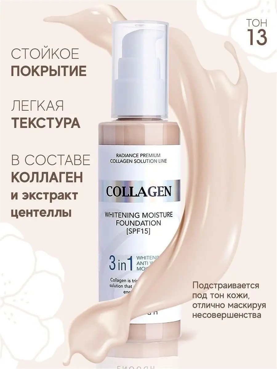 Омолаживающий тональный крем Collagen Enough Moisture Foundation №13 с spf для лица 15 (солнцезащитный крем от загара) обладает легким покрытием, не сушит кожу и придает сияние. Действие 3в1: отбеливающий крем, крем от морщин, солнцезащитный. Тональный крем для лица помогает скрыть несовершенства (постакне, покраснения от прыщей). Корейский крем для лица увлажняющий содержит: коллаген для лица -удерживает влагу, разглаживает морщинки. Гиалуроновая кислота для лица глубоко увлажняет, придает упругость и эластичность. Необходимо наносить тональник на хорошо увлаженную кожу, чтобы крем тональный для лица ложился тонким ровным слоем.