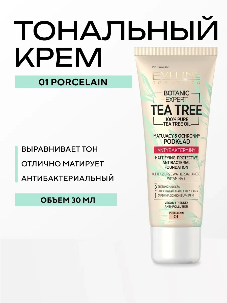 Botanic Expert Tea Tree Mattifying Antibacterial Foundation gives skin a satin-matte finish and guarantees a flawless look. Its innovative formula allows for variable coverage, concealing imperfections and redness. It won't dry out skin or clog pores. -ANTIBACTERIAL EFFECT: 100% natural tea tree oil. -ZINC and ANTISEPTIC complex have antibacterial properties and help reduce sebum production and imperfections. -PROTECTIVE FUNCTION: Green tea extract acts as a natural barrier against harmful environmental factors, while VITAMIN E regenerates and protects against free radicals.