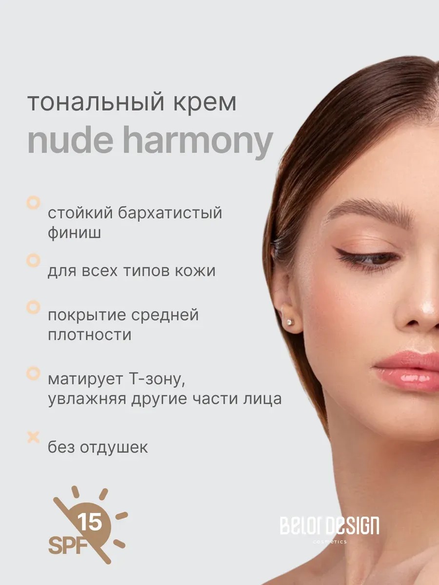 Жидкий тональный крем NUDE HARMONY тон 201 светло-бежевый аккуратно выравнивает естественный оттенок, обеспечивая базу макияжа с бархатистым финишем на весь день. На него идеально ложится другая декоративная косметика от Белор. Уникальная формула средства подходит для проблемной и комбинированной кожи. Эта тоналка адаптируется под любой цветотип позволяя достичь эффекта «второй кожи». Основа ББ крема обладает стойким покрытием средней плотности и эффективно матирует Т-зону, в то время как другие участки получают необходимое увлажнение. Качественная косметика без отдушек гарантирует комфортное нанесение. Увлажняющий бьюти-продукт также защищает от вредного воздействия солнечных лучей благодаря встроенному УФ-фильтру. Этот тональник станет отличным помощником в уходе за лицом, придавая натуральный и светлый оттенок коже.