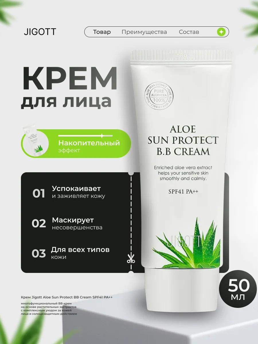 The multifunctional Jigott Aloe Sun Protect BB Cream SPF41 PA++ with aloe extract is an excellent product that combines skin care and decorative cosmetics.