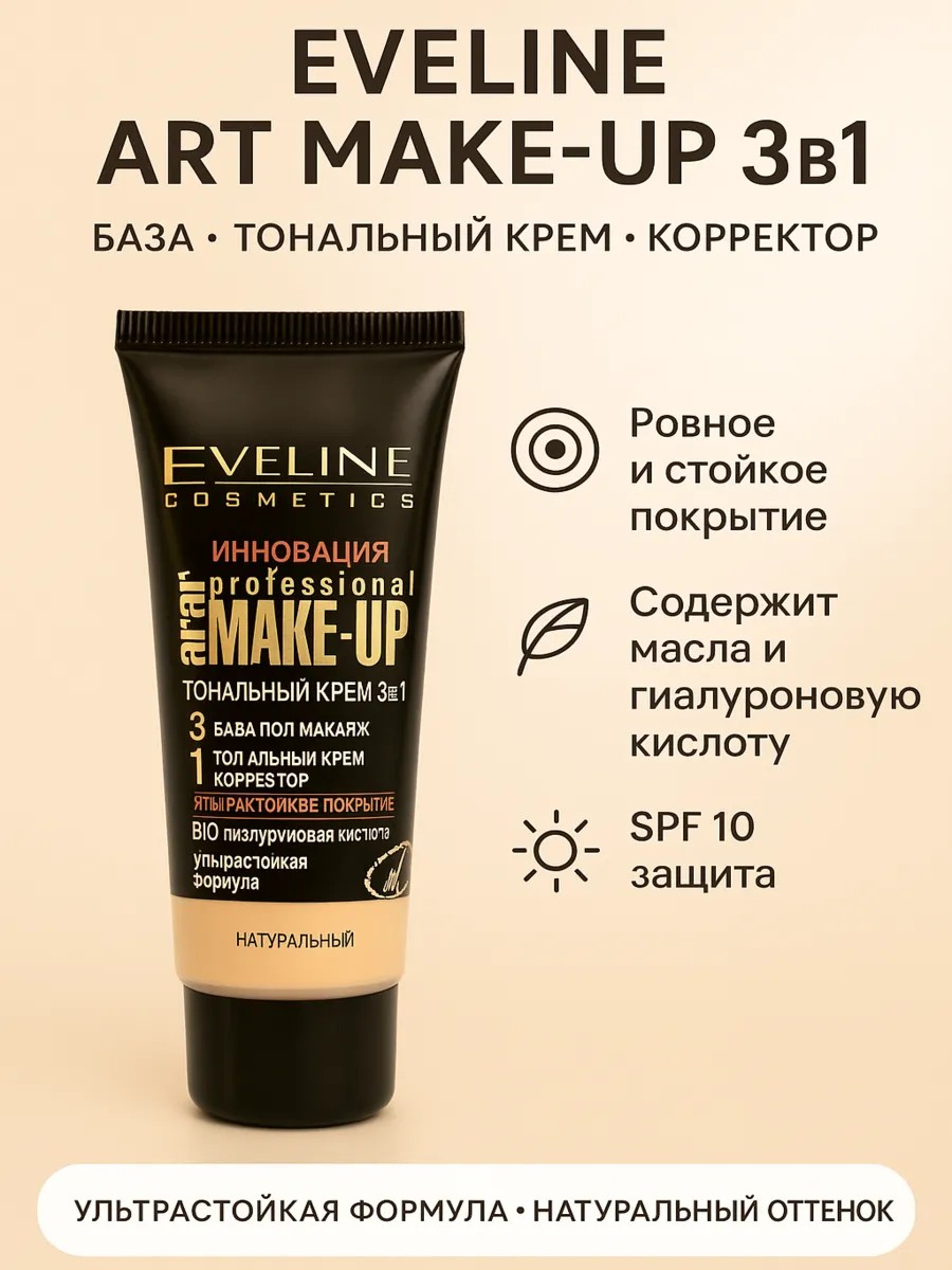 Eveline Cosmetics Art Make-Up Professional 3 в 1 — универсальный тональный крем, база и корректор в одном средстве.