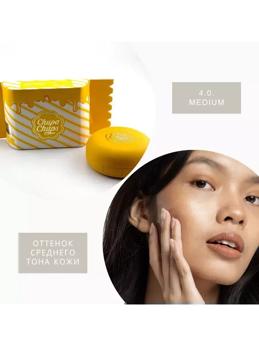 Тональная основа-кушон от Chupa-Chups в оттенке "4.0 Medium" — это идеальное решение для поклонников бьюти-индустрии. Он быстро завоевал популярность благодаря своим исключительным свойствам, которые помогают улучшить тон кожи и скрыть недостатки. Кушон придаёт лицу эффект естественного сияния, создавая свежий и ровный цвет.Вы можете наносить этот кушон как легким, так и более плотным слоем, в зависимости от предпочтений по покрытию. В обоих случаях текстура ровно распределяется, не скатывается и не акцентирует внимание на шелушениях.Этот продукт представлен в оттенке "4.0 Medium", который идеально соответствует среднему тону кожа. Компактный и удобный формат тонального кушона. Высокая пигментация для максимального покрытия.Защита от солнца с SPF 50+ PA+++. Эффективно скрывает все несовершенства кожного покрова. Не подчеркивает проблемные участки. Ухаживающий состав с активными компонентами.Ниацинамид (витамин B3) улучшает внешний вид кожи, разглаживает носогубные складки и морщины. Он помогает выровнять тон кожи, усиливает синтез коллагена и снижает чувствительность. Гиалуроновая кислота, естественный компонент, удерживает влагу в клетках, создавая увлажняющий барьер и обеспечивая антивозрастное Аденозин — современный антивозрастной ингредиент, который значительно увеличивает производство эластина и коллагена, смягчая и подтягивая кожу, при этом замедляет процессы старения и обладает противовоспалительным эффектом. Откройте упаковку и поверните белую крышку кушона Chupa-Chups по часовой стрелке. Наберите средство спонжем и равномерно нанесите на кожу лица и шеи. Закройте упаковку, поворачивая крышку против часовой стрелки, и плотно зафиксируйте её.