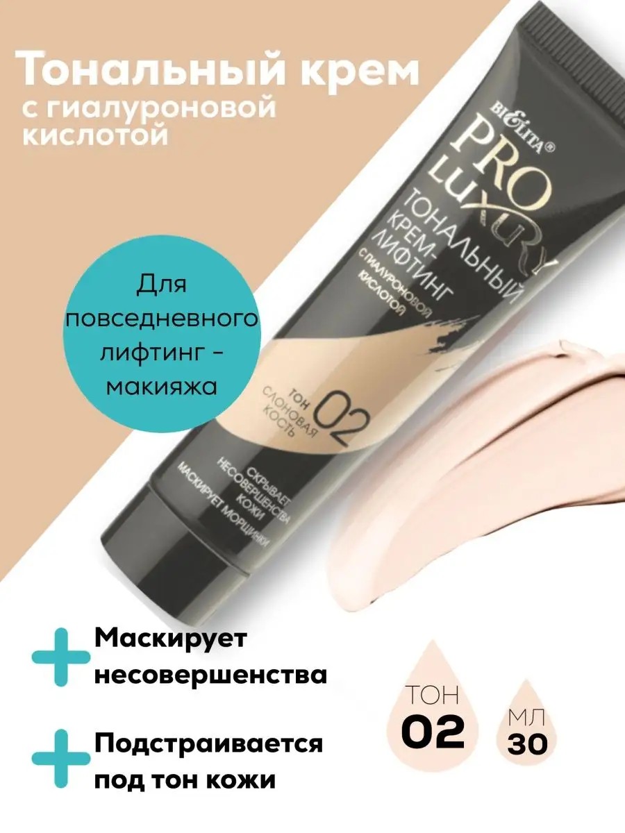 Тональный крем-лифтинг для лица с гиалуроновой кислотой PRO LUXURY тон 02 30 мл от белорусского производителя - секрет Вашего мгновенного преображения. Крем сочетает в себе 100% натуральные пигменты, подстраивающиеся под естественный тон кожи и комплекс активных компонентов, которые необходимы для создания идеального макияжа. Тональник скрывает несовершенства кожи, выравнивая её тон, безупречно маскирует морщинки, обеспечивает лифтинг-эффект, не создает эффекта маски и не блокирует поры, не стирается от прикосновений. Способ применения: нанесите крем на чистую кожу лица, шеи и зоны декольте, равномерно распределите массажными движениями. При помощи косметики, представленной в нашем магазине, можно выбрать подарок (на 8 марта, новый год ), собрать подарочный набор, beauty box женщине сестре девушке любимой маме жене подруге на день рождения. Теги для поиска: cc бб вв крема, от темных кругов и синяков вокруг глаз, праймер, корректор. Оцените качество одного из лучших брендов косметики БЕЛИТА!