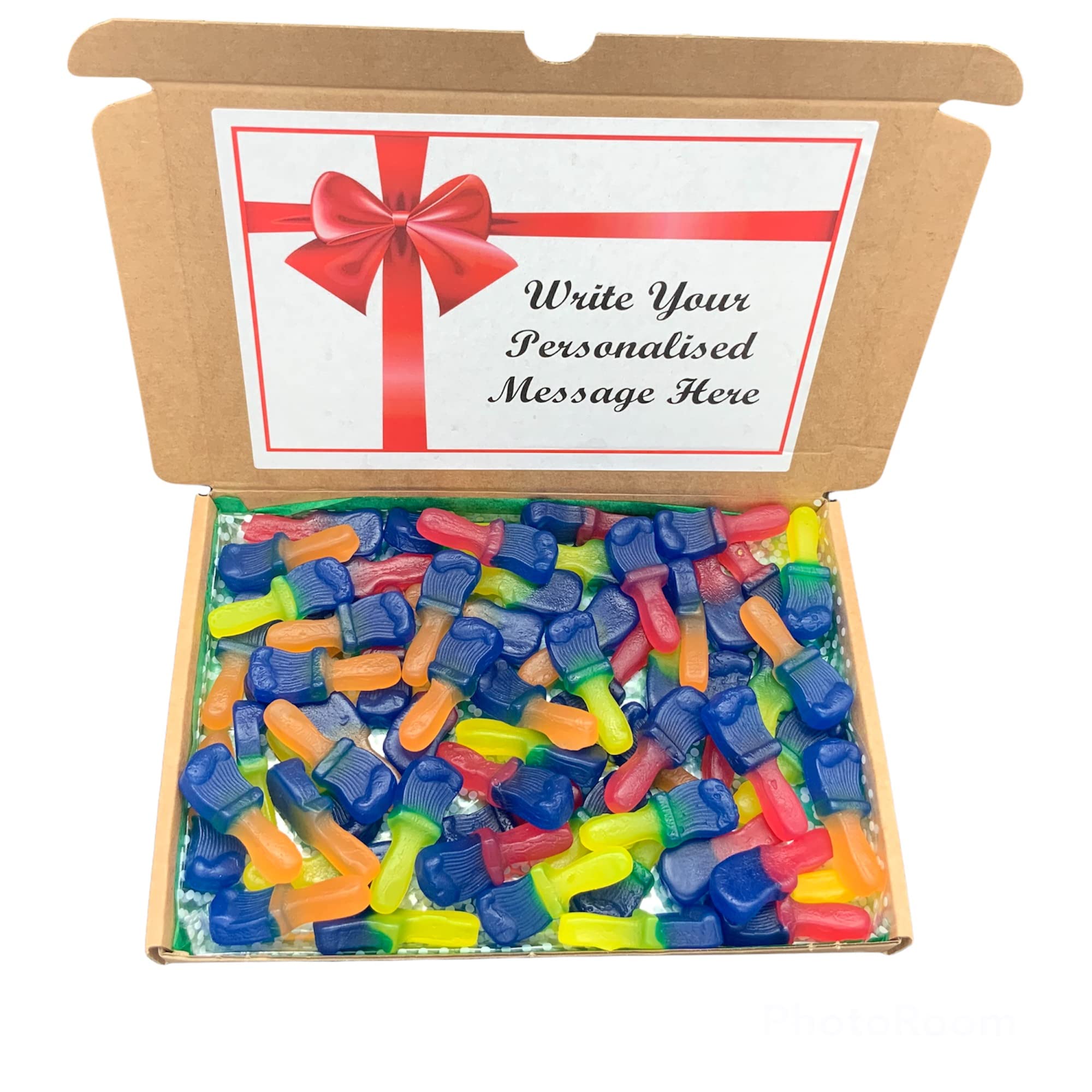 A fun gummy sweet that paints your tongue Fruit flavoured pick n mix sweet These paintbrush-shaped pick and mix sweets change the colour of your tongue! Popular with kids of all ages. [ Suitable for Vegan, Vegetarian, Dairy Free, Gelatine Free] Ingredients:- Sugar, Glucose syrup, Wheat starch, Water, Modified maize starch, Modified potato starch, Acids: Lactic acid, Malic acid, Citric acid Flavourings, Vegetable Oil (Coconut), Glazing agent (Carnauba wax), Colours: curcumin, brilliant blue FCF, paprika extract Fruit and vegetable concentrate: black carrot. INGREDIENTS Sugar, Glucose syrup, Wheat starch, Water, Modified maize starch, Modified potato starch, Acids: Lactic acid, Malic acid, Citric acid Flavourings, Vegetable Oil (Coconut), Glazing agent (Carnauba wax), Colours: curcumin, brilliant blue FCF, paprika extract Fruit and vegetable concentrate: black carrot.