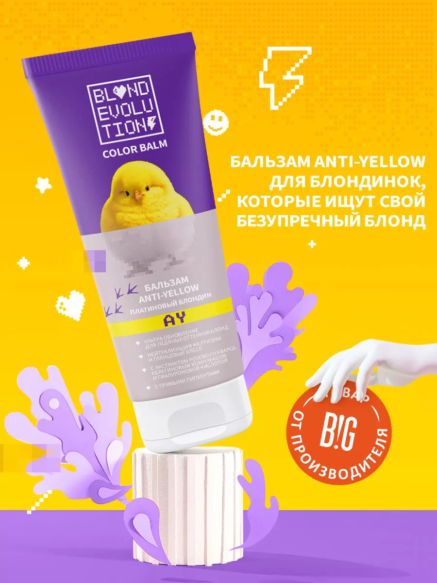 Блонд в моде при любой погоде! Оттенков блонда очень много, но любой из них подвержен проявлению нежелательной желтизны. Хочешь безупречный блонд прямо сейчас? Легко! Мы нашли решение 3-в-1: тонирование без пятен, уход и блеск. Идеальный блонд с нами - быстро и непринужденно. Оттенок цыпленка на флаконе расскажет о твоем будущем блонде все! Используй Платиновый блондин для обновления своего цвета или для совершенно нового преображения. Бальзам обеспечит увлажнение, легкое расчёсывание и уберёт пушистость. 1. УЛЬТРА ОБНОВЛЕНИЕ ХОЛОДНЫХ ОТТЕНКОВ БЛОНД 2. НЕЙТРАЛИЗАЦИЯ ЖЕЛТИЗНЫ И ГЛЯНЦЕВЫЙ БЛЕСК 3. С ЭКСТРАКТОМ РОЗОВОГО КВАРЦА, КЕРАТИНОВЫМ КОМПЛЕКСОМ И ГИАЛУРОНОВОЙ КИСЛОТОЙ 4. С ПРЯМЫМИ ПИГМЕНТАМИ. Наносить на влажные волосы после шампуня и равномерно распределить по всей длине волос , делая отступ от корневой зоны. Время выдержки: до 5 минут для поддержания цвета; до 10 минут для получения легкого оттенка; до 20 минут для более насыщенного оттенка. Смыть теплой водой, пока вода не станет прозрачной. Применять после шампуня. Не рекомендуем разбавлять с обычным бальзамом.