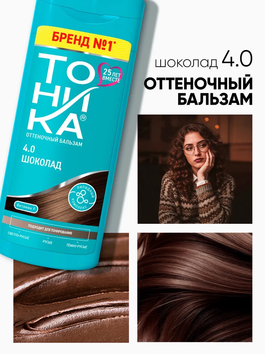 Тон 4.0 Шоколад благодаря сочетанию идеально подобранных пигментов придаст волосам многогранный и выразительный оттенок, а активные компоненты облегчат расчесывание и увлажнят волосы. Тонирует незначительную седину. Для тёмно-русых и русых волос. Без аммиака, перекиси и спирта. Красивый цвет и натуральное сияние. Оттеночный бальзам ТОНИКА Подходит для поддержания цвета окрашенных волос, обновления оттенка натуральных волос и тонирования отросших корней. Секрет оттеночного средства в эксклюзивном коктейле пигментов, который придает волосам выразительный оттенок. Оттеночный бальзам обогащён дополнительными активными компонентами, которые ухаживают за волосами в процессе тонирования. Экстракт белого льна и витамин F увлажняют и питают волосы, способствуют разглаживанию структуры и придают волосам натуральный блеск.ТОНИКА натуральные оттенки - безопасная альтернатива стойким краскам, позволяют поддерживать насыщенный оттенок между окрашиваниями. Маскирует незначительные седые прядки, создавая блики на волосах. При регулярном использовании оттенок может накапливаться. Частоту применения оттеночного средства вы сможете подобрать для себя индивидуально. Пользуйтесь перчатками, защищайте одежду полотенцем. Нанесите оттеночный бальзам на влажные волосы и равномерно распределите. Время выдержки: 3-5 мин. - для обновления цвета; 10-15 мин - для легкого оттенка; до 30 мин. - для получения более насыщенного оттенка. По истечении времени тщательно промойте волосы теплой водой. Натуральные оттенки Тоники в зеленых флаконах не подходят для тонирования обесцвеченных волос. Сделайте тест-прядь. Если вы первый раз сталкиваетесь с оттеночными средствами ТОНИКА или сменили оттенок, обязательно сделайте тест-прядь. Это потребует дополнительного времени, но поможет понять вам, как оттеночное средство работает именно на ваших волосах. Помните, результат тонирования зависит не только от качества оттеночного средства, но и от исходного цвета и качества волос.