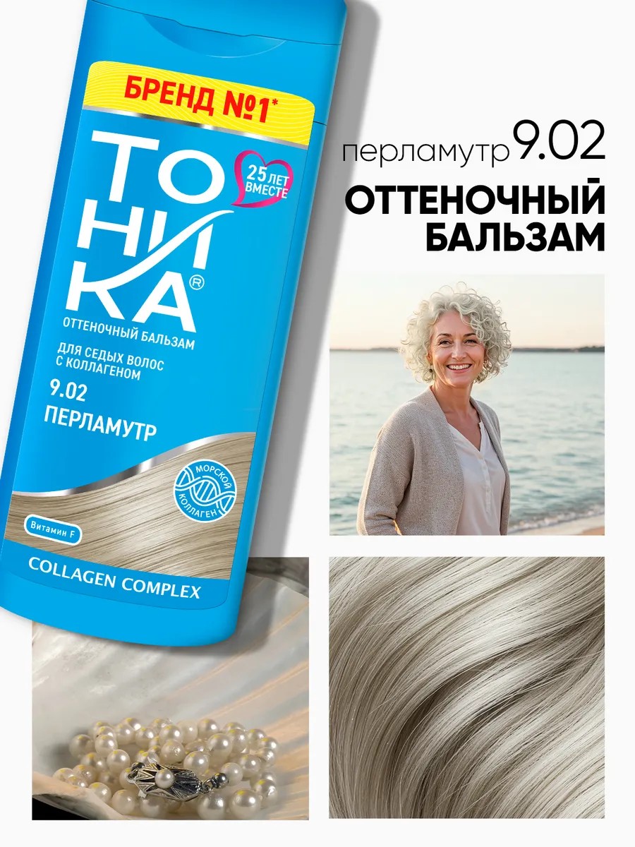 Оттеночный бальзам ТОНИКА 9.01 Аметист подчеркивает благородство природной седины, придает волосам пастельный оттенок с лёгким лавандовым подтоном. 8.05 Холодный бежевый подчеркивает благородство природной седины, придает волосам лёгкий, свежий и максимально естественный оттенок. 02 Перламутр подчеркивает благородство природной седины, придает волосам нежный оттенок с холодным подтоном. 9.10 Дымчатый топаз подчеркивает благородство природной седины, придает волосам пастельный оттенок с холодным подтоном. Секрет оттеночного средства в высокой концентрации пигментов, которые обеспечивают стойкое тонирование седины. Формула оттеночного бальзама обогащена активными компонентами, которые ухаживают за волосами в процессе тонирования. Морской коллаген кондиционирует волосы, делает их более гладкими и блестящими. Экстракт белого льна и витамин F увлажняют волосы и кожу головы. Бальзам безопасен для структуры волос, так как не содержит агрессивные компоненты (аммиак, перекись). Оттенок не предназначен для тонирования обесцвеченных волос. Для осветленных и светлых волос можно подобрать оттенок из специальной серии в серых флаконах. ТОНИКА для седых волос - это 4 завораживающих оттенка. Идеально подобранные композиции пигментов придают утонченный тон и драгоценные переливы седым волосам, устраняют нежелательный подтон, дарят здоровый блеск и дополнительный уход. ТОНИКА для седых волос обеспечивает видимый результат после первого применения. Частоту применения оттеночного средства вы сможете подобрать для себя индивидуально. Пользуйтесь перчатками, а также защищайте одежду полотенцем. Нанесите жирный крем по линии роста волос и на уши во избежание окрашивания кожи. Нанесите оттеночный бальзам на влажные волосы и равномерно распределите. Время выдержки на волосах: для получения легкого оттенка - до 10 минут, для полной нейтрализации седины - до 45 мин. По истечении времени промойте волосы теплой водой, пока не станет прозрачной.
