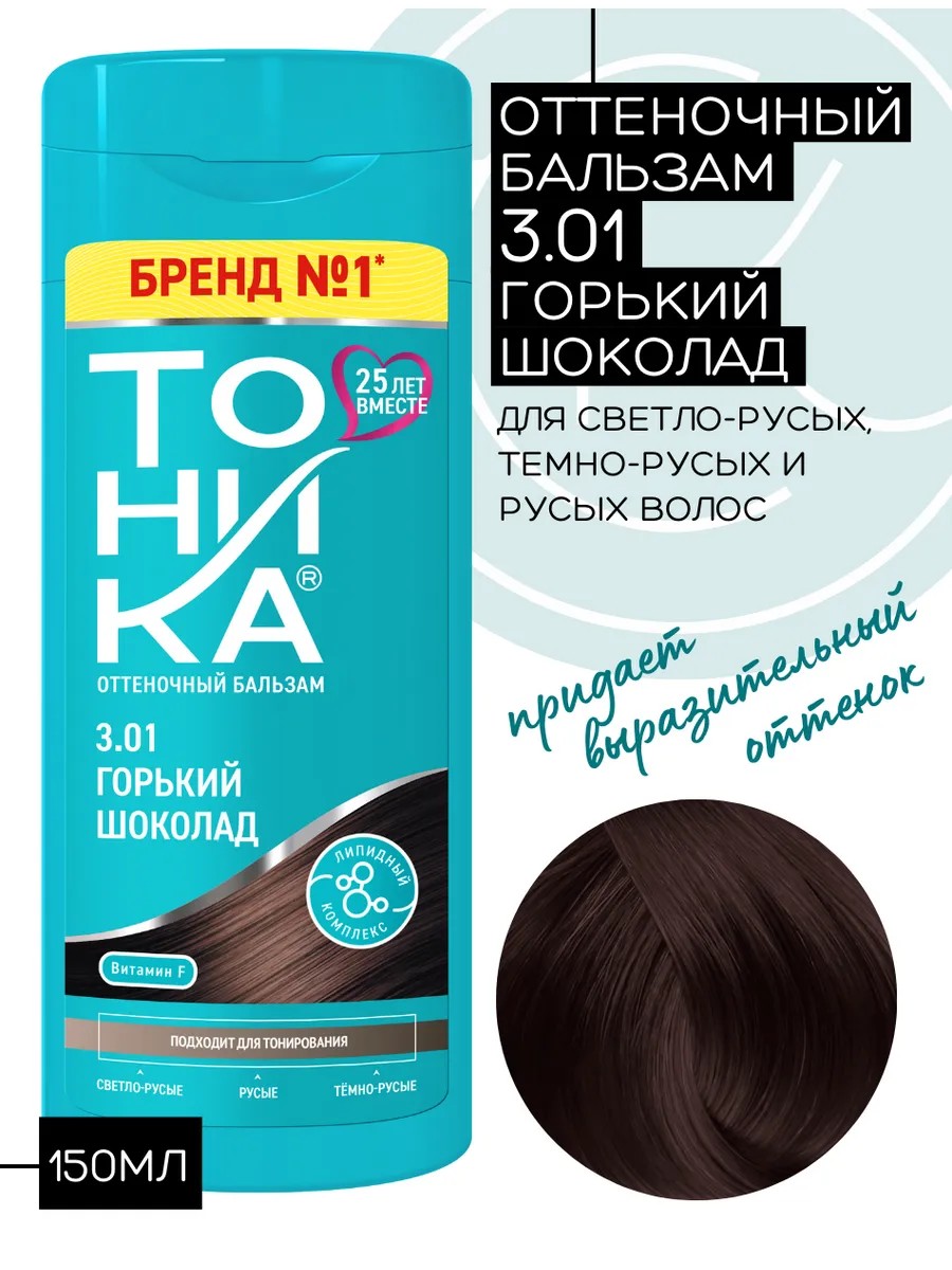 Tinted conditioner for light brown, dark brown, and light brown hair, shade 3.01 Dark Chocolate, gives hair a distinctive iridescent hue and covers slight gray hair. Thanks to a combination of perfectly matched pigments, tinted hair balms provide gentle toning. Active ingredients make combing easier and moisturize hair. Provides long-lasting color and gradually washes out with shampoo. Contains natural ingredients: grape seed oil, bamboo extract, silk extract, cotton extract, vitamin F. These products do not contain ammonia, formaldehyde, persulfates, peroxide, or alcohol. Tonika tinted hair products are gentle on your hair, offering high quality and time-tested effectiveness.