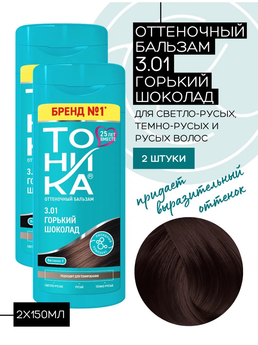A set of 2 tint conditioners for light brown, dark brown, and light brown hair, shade 3.01 Dark Chocolate, imparts a vibrant, iridescent hue and covers slight gray hair. Thanks to a combination of perfectly matched pigments, these tint conditioners provide gentle toning. Active ingredients make combing easier and moisturize hair. They provide long-lasting color and gradually wash out with shampoo. Contains natural ingredients: grape seed oil, bamboo extract, silk extract, cotton extract, and vitamin F. These products are free of ammonia, formaldehyde, persulfates, hydrogen peroxide, and alcohol. Tonika tint conditioners are gentle on your hair, offering high quality and time-tested effectiveness.