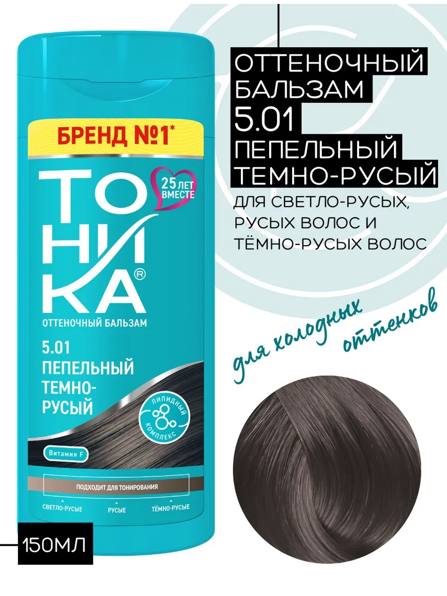 Оттеночный бальзам для светло-русых, русых и тёмно-русых волос, тон 5.01 Пепельный темно-русый благодаря сочетанию идеально подобранных пигментов придаст волосам глубокий натуральный оттенок с холодным направлением и подарит блеск, тонирует незначительную седину. Благодаря сочетанию идеально подобранных пигментов, оттеночные бальзамы для волос обеспечивают бережное тонирование. Активные компоненты облегчают расчесывание и увлажняют волосы. Обеспечивает стойкий цвет и постепенно смывается при мытье головы шампунем. Содержит натуральные компоненты: Масло виноградной косточки, Экстракт бамбука, Экстракт шелка, Экстракт хлопка, Витамин F. Средства не содержат аммиака, формальдегидов, персульфатов, перекиси и спирта. Оттеночные средства для волос «Тоника» — это бережное отношение к Вашим волосам, высокое качество и эффективность, проверенные временем.