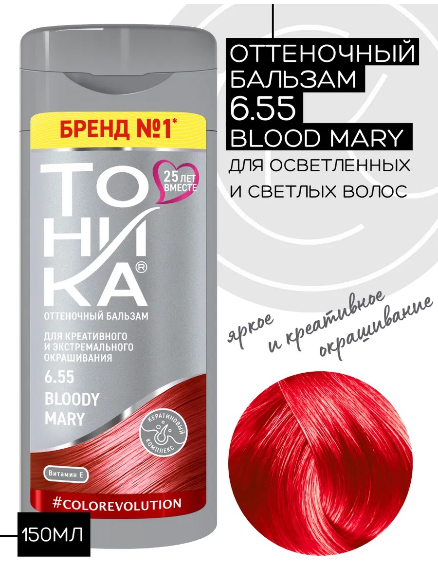 Оттеночный бальзам с прямыми пигментами Тоника COLOREVOLUTION тон 6.55 Bloody Mary (кровавая Мэри) для временного тонирования в ультрамодные яркие цвета, обеспечивает множество вариантов для экспериментов и выражения индивидуальности, создания яркого неповторимого образа. Формула с насыщенными пигментами обеспечивает стойкое и равномерное тонирование ваших локонов в сочный и насыщенный красный тон, это безопасная альтернатива стойким краскам и предполагает временное тонирование волос. Активные компоненты облегчают расчесывание, ухаживают, питают и увлажняют волосы. Обеспечивает стойкий красный цвет и постепенно смывается при мытье головы шампунем. Содержит натуральные компоненты: Масло виноградной косточки, Кератин, Экстракт бамбука, Экстракт шелка, Экстракт хлопка, Витамин F. Способствует разглаживанию структуры и придает локонам натуральный блеск. Благодаря своей уникальной формуле повышает плотность и эластичность, восстанавливают поврежденные участки, укрепляют, делая их здоровыми и ухоженными. Бальзам ТОНИКА можно использовать как салонный уход. Обеспечивает видимый результат после первого применения. Тоник идеально подходит для тонировки волос, если вы хотите изменить свой образ, но не хотите повреждать локоны стойкими красками. Средства не содержат аммиака, формальдегидов, персульфатов, перекиси и спирта. С данным оттенком ваши волосы станут манящими и привлекающие внимание. Оттеночные средства для волос «Тоника» — это бережное отношение к Вашим волосам, высокое качество и эффективность, проверенные временем.