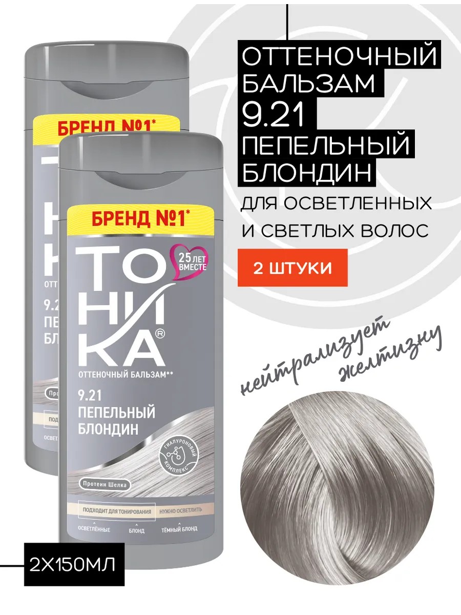 Набор из 2 шт. оттеночных бальзамов тон 9.21 Пепельный блондин придаст волосам благородный оттенок с морозным серебристым отливом, подчеркнет красоту Вашего блонда и нейтрализует желтизну. Благодаря сочетанию идеально подобранных пигментов, оттеночные бальзамы для волос обеспечивают бережное тонирование. Активные компоненты облегчают расчесывание и увлажняют волосы. Обеспечивает стойкий цвет и постепенно смывается при мытье головы шампунем. Содержит натуральные компоненты: Масло виноградной косточки, Экстракт бамбука, Экстракт шелка, Экстракт хлопка, Витамин F. Средства не содержат аммиака, формальдегидов, персульфатов, перекиси и спирта. Оттеночные средства для волос «Тоника» — это бережное отношение к Вашим волосам, высокое качество и эффективность, проверенные временем.