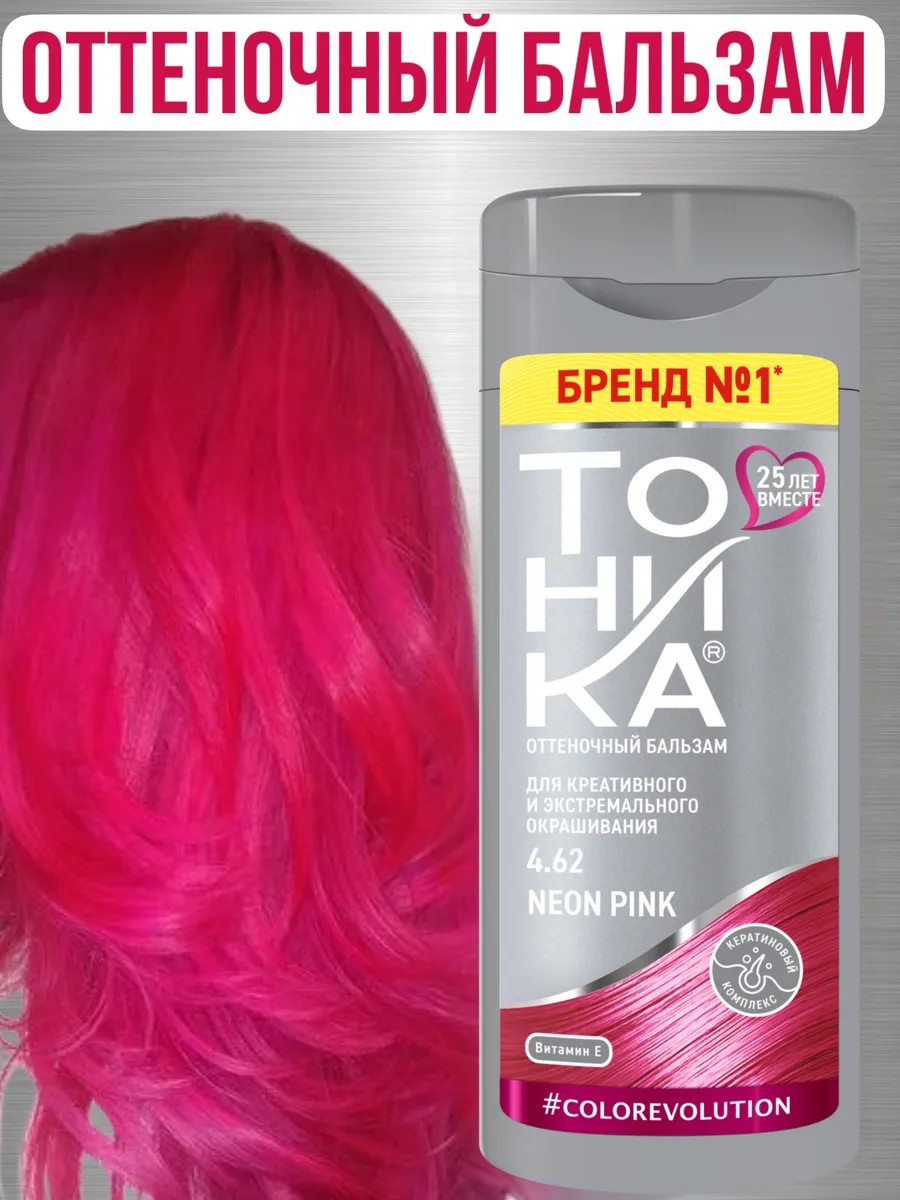Бальзам для тонирования волос 4.62 Розовый неон. Тоника Colorevolution NEON PINK- линейка средств для временного тонирования волос в ультрамодные сочные цвета! Формула с насыщенными пигментами обеспечивает стойкое и равномерное тонирование, активные компоненты облегчают расчесывание и увлажняют волосы. ТОНИКА - это оттеночный бальзам для волос без аммиака, перекиси и спирта. Оттеночный бальзам облегчает расчесывание, а также равномерно тонирует их, что делает волосы более здоровыми и блестящими. Способствует разглаживанию структуры и придает волосам натуральный блеск. Экстракт белого льна и витамин F увлажняют и питают волосы, делая их мягкими и шелковистыми. Лимонная кислота возвращает волосам жизненный блеск, прочность. Эти компоненты помогают ухаживать за волосами во время процесса окрашивания. Благодаря своей уникальной формуле повышает плотность и эластичность, восстанавливают поврежденные участки, укрепляют волосы, делая их здоровыми и ухоженными. Тоник для волос подходит для поддержания цвета окрашенных волос, обновления оттенка натуральных волос и тонирования отросших корней. Он маскирует незначительные седые. Если вы хотите получить пастельный цвет, вы можете смешать тонирующее средство с нейтральной базой, такой как обычный бальзам или кондиционер для волос. Оттеночные средства для волос «Тоника» — это высокое качество и эффективность, проверенные временем и доступные каждому. СПОСОБ ПРИМЕНЕНИЯ: Пользуйтесь перчатками, защищайте одежду полотенцем. Нанесите оттеночный бальзам на чистые сухие волосы и равномерно распределите. Время выдержки: для "поддержания цвета" - 3-5 мин., для получения легкого оттенка - до 10 мин., для более насыщенного - до 30 мин. По истечении времени промойте волосы теплой водой. Для получения пастельного оттенка смешайте бальзам с нейтральной базой (обычный бальзам/ кондиционер для волос). Максимальный эффект проявляется на осветленных волосах. Постепенно смывается с волос при мытье головы шампунем.