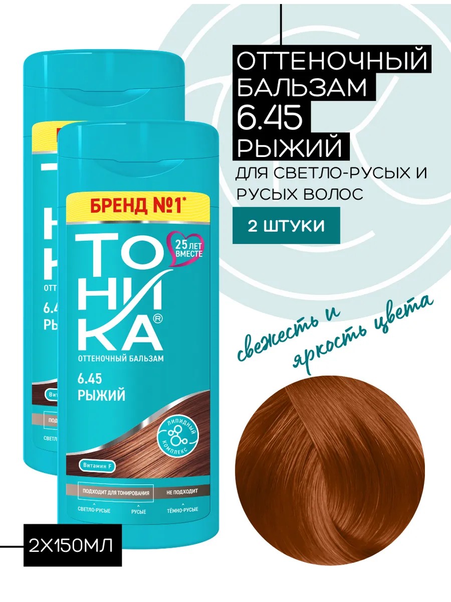 Набор из 2 шт. оттеночных бальзамов для светло-русых и русых волос, тон 6.45 Рыжий, переливающийся бликами оттенок придаст красивый и ровный цвет. Благодаря сочетанию идеально подобранных пигментов, оттеночные бальзамы для волос обеспечивают бережное тонирование. Активные компоненты облегчают расчесывание и увлажняют волосы. Обеспечивает стойкий цвет и постепенно смывается при мытье головы шампунем. Содержит натуральные компоненты: Масло виноградной косточки, Экстракт бамбука, Экстракт шелка, Экстракт хлопка, Витамин F. Средства не содержат аммиака, формальдегидов, персульфатов, перекиси и спирта. Оттеночные средства для волос «Тоника» — это бережное отношение к Вашим волосам, высокое качество и эффективность, проверенные временем.