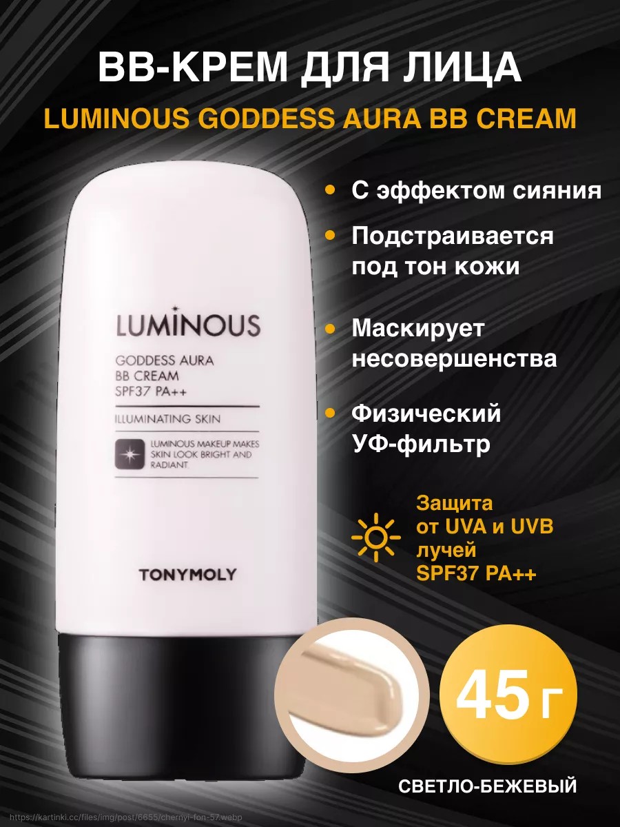 Корейская косметика славится своим качеством и инновационными технологиями, и BB-крем для лица с эффектом сияния TONY MOLY Luminous Goddess Aura BB Cream SPF37 PA++ не исключение. Этот мультифункциональный продукт объединяет в себе свойства тонального, увлажняющего и солнцезащитного средства. Эти свойства позволяют сократить время, затрачиваемое на макияж и уход за кожей, что делает бб крем идеальным выбором для занятых женщин. Он обладает лёгкой текстурой и не забивает поры, прекрасно маскирует несовершенства благодаря высокой перекрывающей способностью. Выравнивает и освежает цвет лица, делает его красивым и отдохнувшим, придавая сияние и свежесть. Высокий уровень спф 37 обеспечивает защиту от солнца, излишнего загара и появления пигментации. Оксид цинка регулирует работу сальных желез, матирует кожу, оказывает обеззараживающее и вяжущее действие, одновременно является физическим солнцезащитным фильтром. ВВ-крем подходит для любого возраста и типа кожи, в том числе сухой, проблемной и чувствительной. Внимание! Производитель не запаивает коробку в слюду, не ставит пломбу - защиту от вскрытия. Носик не запаян фольгой. Дизайн упаковки может меняться. Актуальный внешний вид упаковки можно посмотреть на официальном сайте бренда.