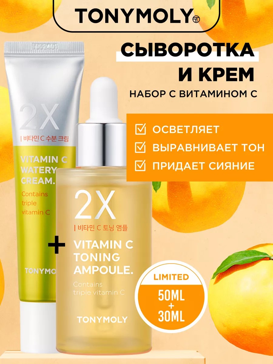 Осветляющий набор из сыворотки (50 мл.) и крема для лица (30 мл.) 2X Vitamin C Toning Ampoule Special Set с витамином С способствует выравниванию тона кожи, повышает упругость и гладкость, придает сияние и уменьшает выраженность пигментных пятен. АКТИВНЫЕ ИНГРЕДИЕНТЫ: Витамин C, который обладает превосходными антиоксидантными свойствами, стимулирует выработку коллагена, оказывает на кожу разглаживающее и осветляющее действие СПОСОБ ПРИМЕНЕНИЯ: Нанесите одну полную пипетку на очищенную кожу лица, избегая области вокруг глаз. Используйте утром и вечером вместе с дневным и ночным кремом. ЭФФЕКТИВНОСТЬ: Концентрированный крем и сыворотка для лица оказывает на кожу интенсивное увлажняющее, выравнивающее, отбеливающее действие, помогает сохранить ее молодость и красоту. Заметный результат наступает уже через неделю: кожа выглядит более ровной и гладкой. Кожа приобретает здоровое сияние, цвет лица выглядит более свежим, а пигментные пятна становятся менее заметными. Через 30 дней использования пигментные пятна и угревая сыпь заметно сокращаются. Набор подходит для ежедневного ухода за всеми типами женской кожи.