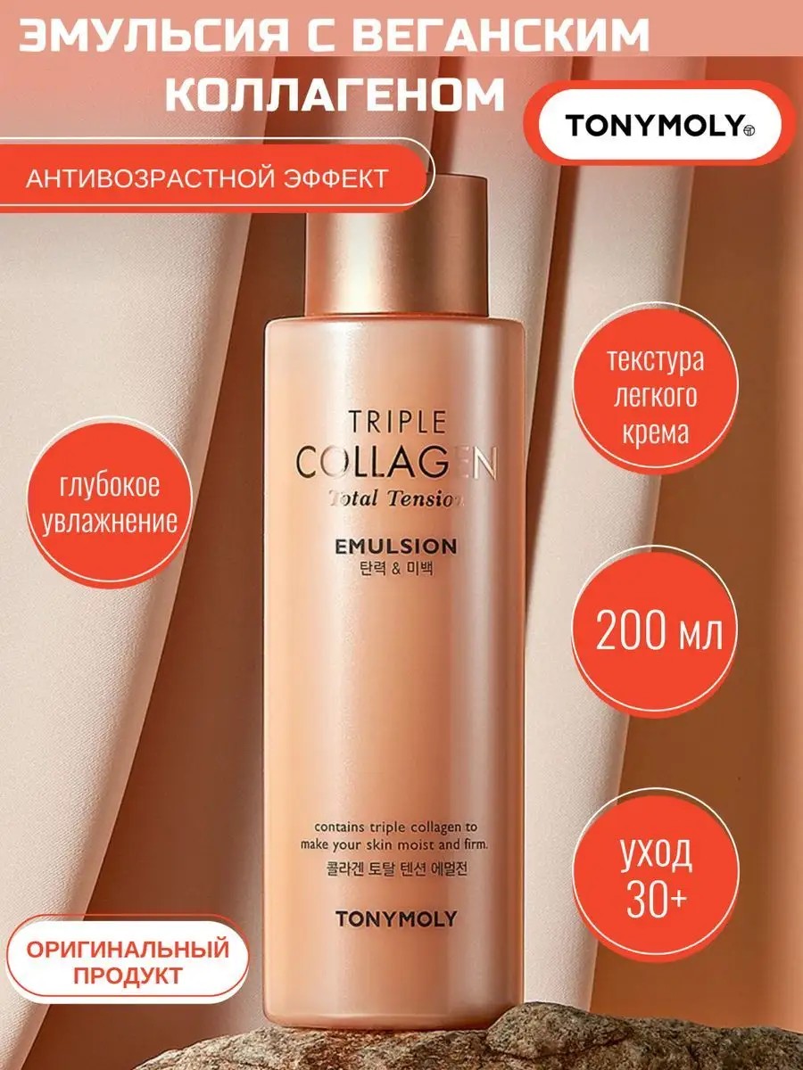 Оригинальный продукт из Южной Кореи. Антивозрастная эмульсия Triple Collagen Total Tension Emulsion от Tony Moly имеет текстуру нежного флюида легко впитывающегося в кожу. В составе уходового средства три вида коллагена и комплекс, состоящий из 7-x производных молекул гиалуроновой кислоты разного размера. Это позволяет эмульсии проникать на разную глубину кожи, обеспечивая многоуровневое увлажнение, а также создавать эффект биологического лифтинга. Эмульсия от Тони Моли повышает эластичность кожи, придавая ей объем и создавая эффект легкого естественного сияния. Кроме того, увлажняющее средство возвращает коже упругость, укрепляет тургор и улучшает защитный барьер, поддерживая необходимый уровень влаги. Подойдет для профилактики возрастных изменений. Подходит для ухода за зоной декольте и шеи. Антивозрастная корейская эмульсия подходит для всех типов кожи (особенно для сухой и чувствительной) и обеспечивает интенсивный лифтинг-эффект при регулярном использовании утром и вечером, подтягивая овал лица. Для более глубокого проникновения компонентов в эпидермис, рекомендуется наносить после тонера. Рекомендуется для женщин и мужчин в возрасте 30+. Способ применения: Используйте утром и/или вечером. Наносите на очищенную кожу лица, шеи и декольте легкими похлопывающими движениями от центра лица к периферии. Особенности: подходит для ежедневного применения, натуральные экстракты, не тестируется на животных, проверено дерматологами. Меры предосторожности: только для наружного применения.