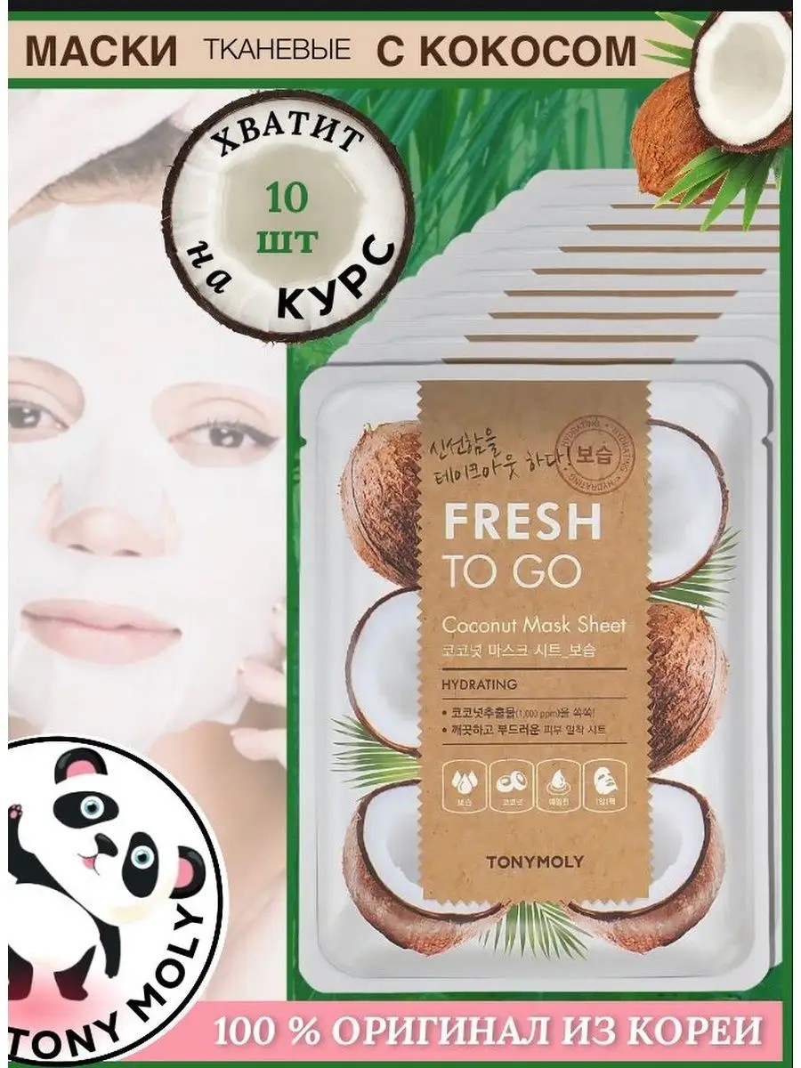 Оригинальный продукт из Южной Кореи. Тканевая маска для лица с экстрактом кокоса обладает приятным и нежным ароматом. Маска для ухода за лицом глубоко питает, увлажняет и разглаживает кожу лица. Увлажняющие маски для лица с экстрактом кокоса значительно улучшают состояние кожи, уменьшают морщины, придают сияние, освежают тусклую и уставшую кожу лица. Натуральная маска в короткий срок устраняет сухость и шелушение. Набор косметических масок для лица 10 шт. Корейская косметика станет прекрасным подарком маме, сестре, подруге, на выпускной. Можно использовать беременным. Маски не оставляют ощущения липкости, не требуют смывания.
