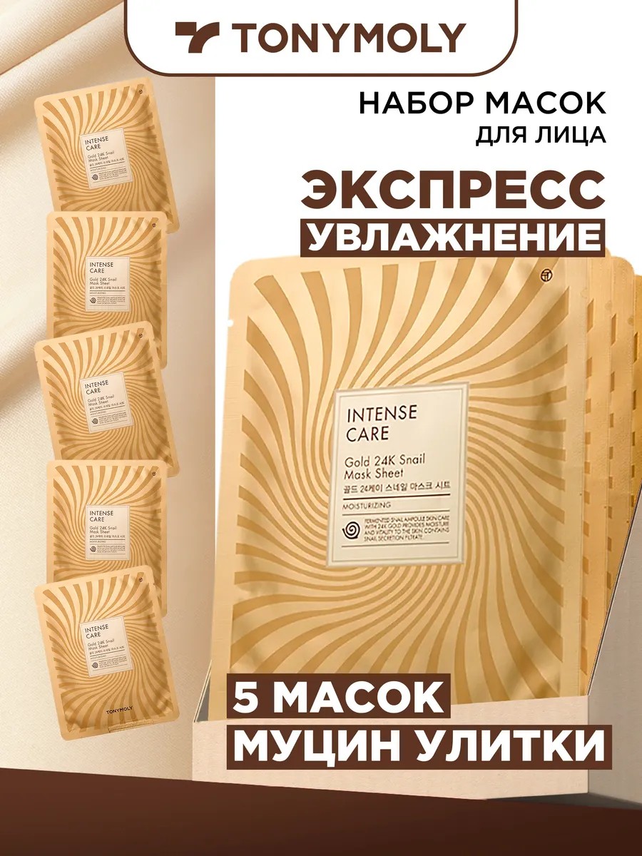 The Intense Care Gold 24K Snail Mask Sheet 5 Gift Set of 5 regenerating masks based on snail mucus and pure gold saturates the skin with oxygen, provides a lifting effect, smooths wrinkles, and improves skin tone. Each mask contains 30% snail mucus filtrate, which effectively combats unwanted pigmentation, evens out skin tone, and promotes active skin regeneration. Pure 24-karat gold particles (10,000 mg) slow collagen breakdown, improve skin elasticity and firmness, and help reduce fine lines and wrinkles, giving skin a renewed appearance and a healthy glow. Use 1-2 times a week.