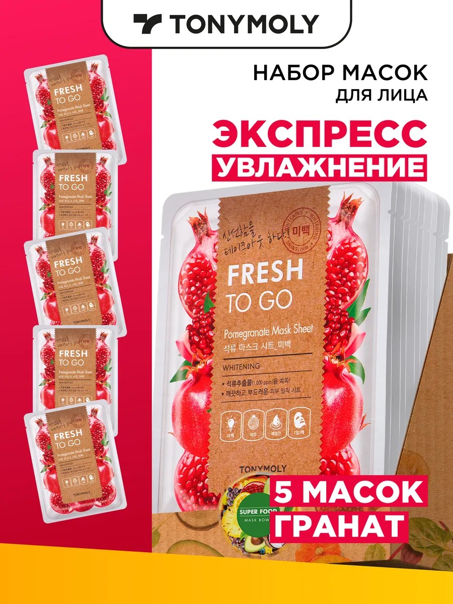 Освежающие тканевые маски TONYMOLY FRESH TO GO активно восстанавливают уставшую кожу, глубоко увлажняют и питают, устраняют тусклость и улучшают цвет лица. Маски насыщают кожу витаминами и микроэлементами, тонизируют, устраняют сухость и стянутость, делают кожу мягкой и бархатистой. Маски подходят для любых особенностей и типов кожи (увлажнение, питание, сужение пор, сияние кожи). Тканевые маски обильно пропитаны питательной эссенцией, которой хватит дополнительно на шею, руки, тело. У масок приятный натуральный аромат свежих фруктов и овощей. Не вызывают аллергии. Можно использовать беременным. Маски не оставляют ощущения липкости, не требуют смывания. Для лучшего эффекта храните их в холодильнике. Ткань у масок плотная, лекало подойдет всем. Способ применения: после этапов очищения и тонизирования нанесите маску на лицо и аккуратно распределите по коже. Через 15-20 минут снимите маску и кончиками пальцев мягко вбейте остатки эссенции. Используйте 1-2 раза в неделю. Набор из 5 масок для лица с экстрактом граната Fresh To Go Pomegranate Mask.Осветляющая тканевая маска для лица с экстрактом граната поддерживает гидробаланс эпидермиса и освежает цвет лица, оказывает мощное увлажняющее действие, насыщает кожу нужными питательными веществами, осветляет и выравнивает тон лица, придает кожному покрову мягкость и гладкость, плотно прилегает к коже, не вызывая при этом дискомфортные ощущения и усиливая действие сыворотки. Улучшает снабжение клеток питательными веществами и кислородом, тем самым возвращая коже ухоженный вид и красивый румянец. Проверяйте целостность упаковки!