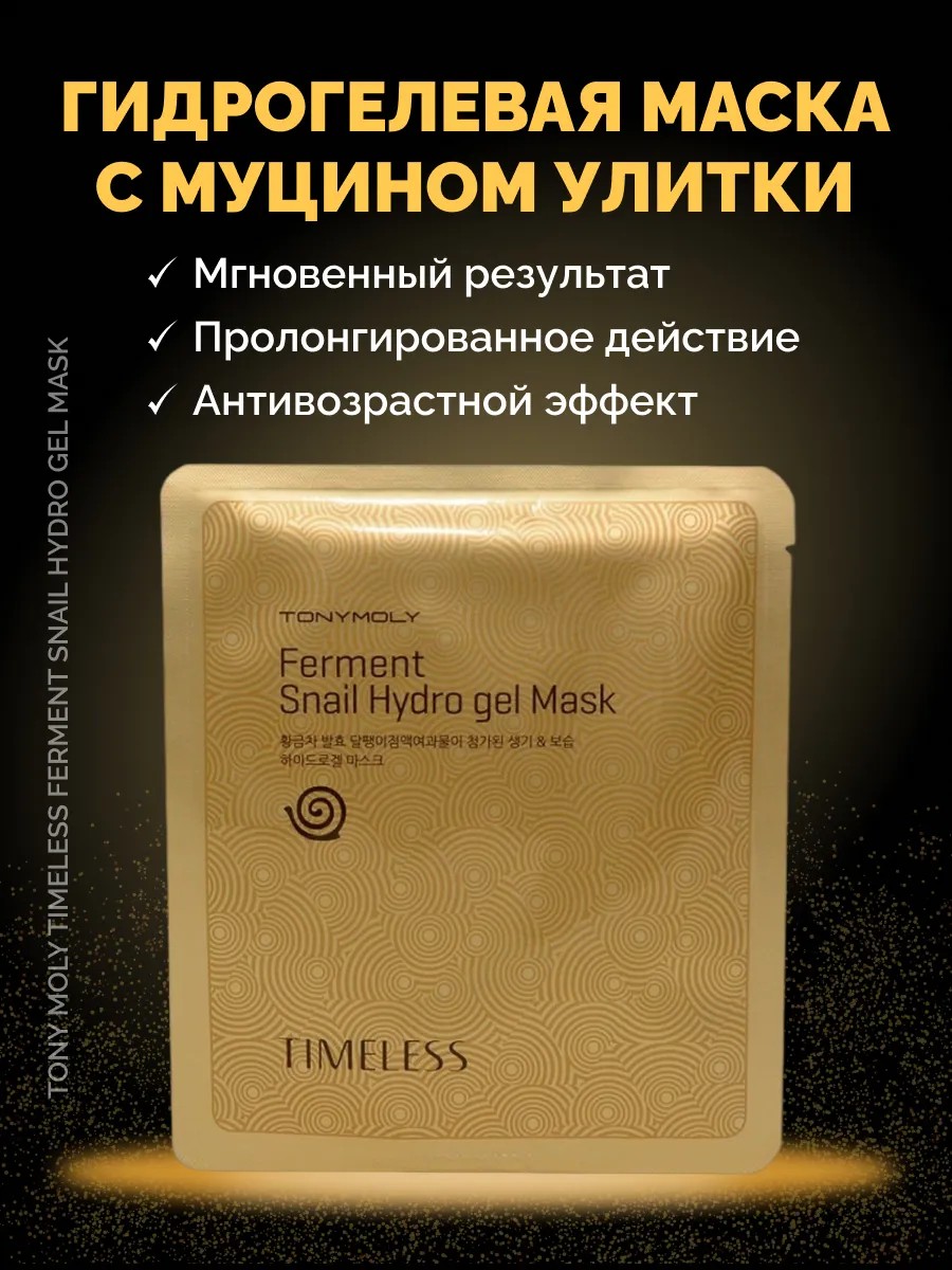 Гидрогелевая маска для лица Timeless Ferment Snail Hydro Gel Mask с муцином улитки корейского бренда TONY MOLY - идеальное решение для борьбы с различными проблемами кожи: пигментация, покраснения и постакне, морщины и воспаления. Содержит мощные антивозрастные и лечебные компоненты. Это делает ее подходящей для любого типа кожи и возраста. Маска с основой из гидрогеля обладает мгновенным эффектом, который можно увидеть сразу после использования. Она предотвращает возрастные изменения кожи: подтягивает ее, делает более упругой и эластичной, а также разглаживает морщины и заломы. Восстанавливает поврежденную и сухую кожу. Помогает предупредить трансэпидермальную потерю воды, насыщает кожу энергией и способствует усилению защиты. Способствует осветлению и выравниванию тона кожи, а также устранению воспалений и раздражений, поэтому ее можно применять при чувствительной и проблемной коже. Растительные экстракты оказывают мощное увлажняющее и успокаивающее действие. Кожа становится увлаженной, более гладкой и мягкой на ощупь. Эффект от использования гидрогелевой маски более пролонгированный, чем от тканевой, и поэтому ее можно применять реже – 1-2 раза в неделю. При регулярном применении этого косметического средства ваше лицо всегда будет иметь здоровый и ухоженный вид.