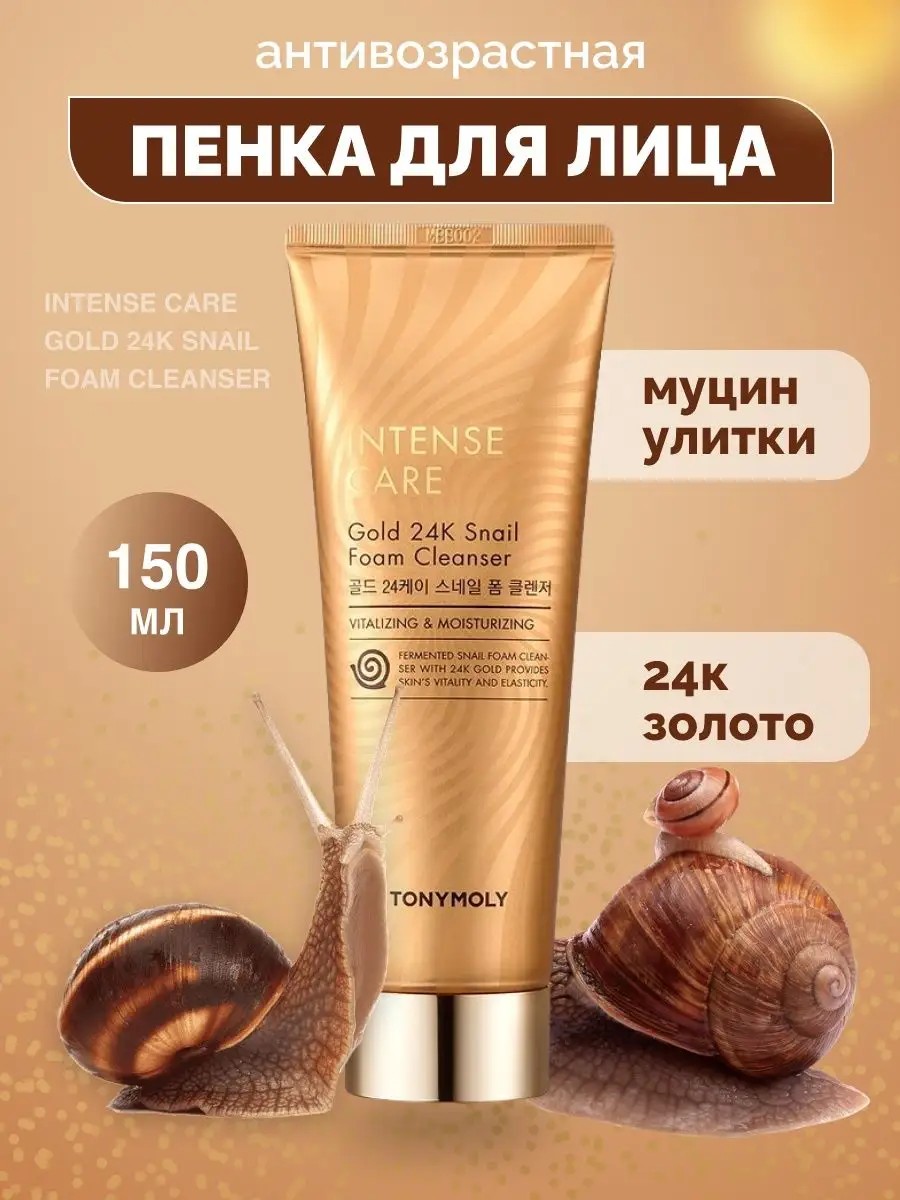Очищающая пенка для лица TONYMOLY Intense Care Gold 24K Snail Foam Cleanser с муцином улитки и золотом выполняет не только основную функцию избавления кожи от пыли, излишков себума и косметики, но также оказывает антивозрастной эффект, повышает жизненный тонус, сохраняет упругость, плотность и эластичность. Ежедневное применение пенки сделает вашу кожу чистой, сияющей, гладкой и бархатистой. Фильтрат улиточной слизи способствует активной регенерации клеток кожи, обеспечивает эффект лифтинга, разглаживает морщины и осветляет пигментацию. Частицы золота и фактор роста клеток EGF замедляют разрушение коллагена, улучшают эластичность и упругость кожи, помогают сократить мимические и глубокие морщины. Помимо этого, золото насыщает кожу кислородом, улучшает проникновение в кожу активных компонентов косметики, выводит токсины, усиливает микроциркуляцию крови и замедляет процессы старения. Масла апельсина, лимона, лайма, бергамота регулируют избыточную жирность кожи, осветляют и освежают ее. Экстракт каллусной культуры женьшеня снимает отечность. Пенка подходит для всех типов кожи, особенно увядающей и пигментированной. Способ применения: небольшое количество нанести на кожу лица и тщательно массируйте кожу примерно 1 минуту, после чего смойте средство теплой водой.