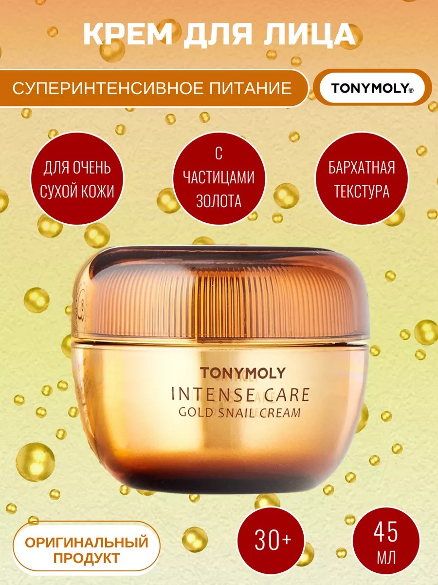 Оригинальный продукт из Южной Кореи. Крем для лица с муцином улитки и золотом TONYMOLY Intense Care Gold Snail Cream разработан специальной для сухой и чувствительной кожи. Глубоко увлажняет, интенсивно питает, разглаживает морщины, придает естественное сияние. Осветляет пигментные пятна, уменьшает покраснения и устраняет шелушения и раздражения кожи. Способствует разглаживанию морщин лба, морщинок вокруг глаз, носогубные складки, поперечные морщины в зоне декольте и шеи. Синергия компонентов включает в себя концентрированный фильтрат слизи улитки (способствует повышению эластичности кожи), частицы золота (удаляют следы стресса и усталости, придает кожи эффект сияния, подсвечивает изнутри), протеины шёлка (обладают регениративными, противовоспалительными, антибактериальными свойствами), масло ши (суперпитательный компонент, успокаивает раздражения), экстракты цитрусовых (выравнивают тон кожи, нейтрализуют действие свободных радикалов). Антивозрастной крем обладает плотной питательной бархатистой текстурой. Быстро впитывается, не оставляет ощущения липкости. Экономичный расход. Возвращает коже свежесть, придает жизненную силу, укрепляет тургор. Баночка с кремом от Тони Моли обладает стильным дизайном, выполнена из высококачественного пластика. Лопатка для нанесения в комплекте. Крем упакован в красивую золотую коробку из плотного картона. Является отличным вариантом подарка как женщине, так и мужчине. Рекомендуется для женщин и мужчин в возрасте 35+. Способ применения: Используйте утром и/или вечером. Наносите на очищенную кожу лица, шеи и декольте легкими похлопывающими движениями от центра лица к периферии. Особенности: подходит для ежедневного применения, натуральные экстракты, не тестируется на животных, проверено дерматологами. Для усиленного действия крема рекомендуется наносить перед его примением сыворотку/тонер/эмульсию. Меры предосторожности: только для наружного применения.